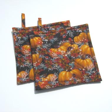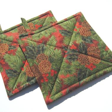 Autumn Woodland Potholders, Leaves and Pinecones Quilted Hot Pads, Rustic Farmhouse Décor, USA Hand Crafted Housewarming or Hostess Gift