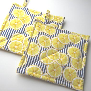 Calico Chickens Potholders, Yellow, Blue, Gray Quilted Hot Pads, USA Hand Made Hostess Gift, Stocking Stuffer, Wrapped Ready for Gift Giving