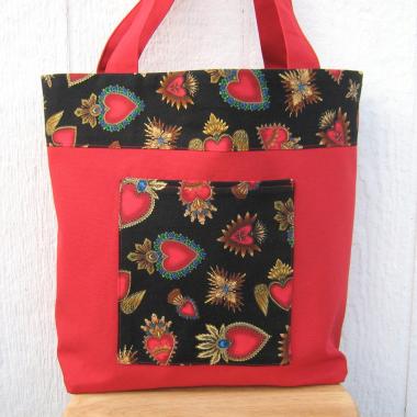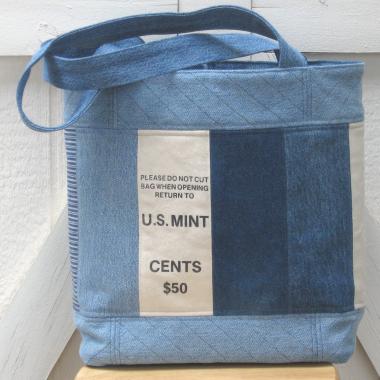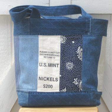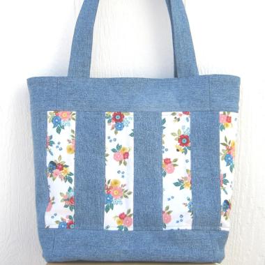 Upcycled Denim Tote, Patchwork Shopping Bag in Repurposed Light Indigo Denim & Floral Cotton, Lined Big Bag with Pockets