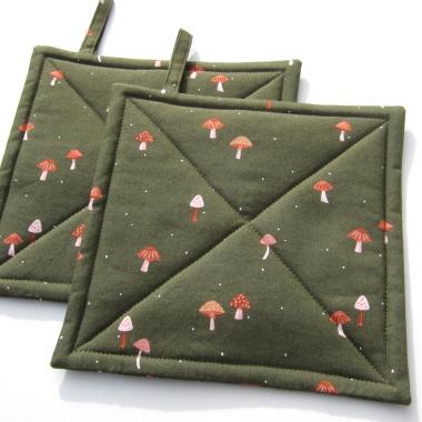 Mushroom and Sunflower Potholders, Forest Green Hot Pads, USA Hand Made Housewarming, Hostess or Mushroom Hunter Gift under $20