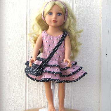 Dusty Pink Ruffled Dress for 18-inch Doll, Matching Bag and Headband, Bees and Polka Dots, Travel or Summer Party Outfit