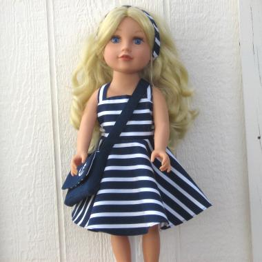 Nautical Blue White Striped Dress for 18-inch Doll, Summer Party Outfit, Cruise Collection, Matching Bag and Headband
