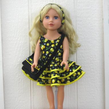 Yellow Lemons Ruffled Dress for 18-inch Doll, Yellow Bias Trim, Matching Bag and Headband, Travel or Summer Party Outfit