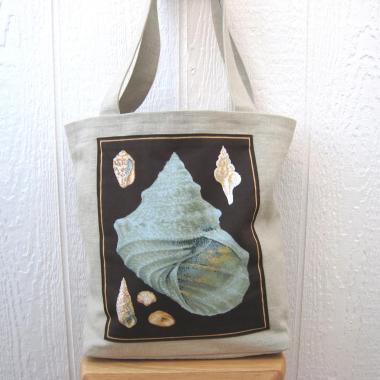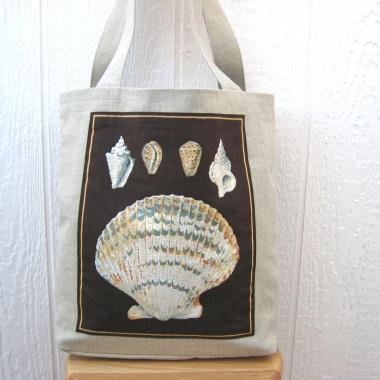 Seaside Tote Bag, Beige Beach Bag with an Assortment of Seashells, Market Shopping Tote, Vintage Fabric Panel, USA Handcrafted in New Mexico