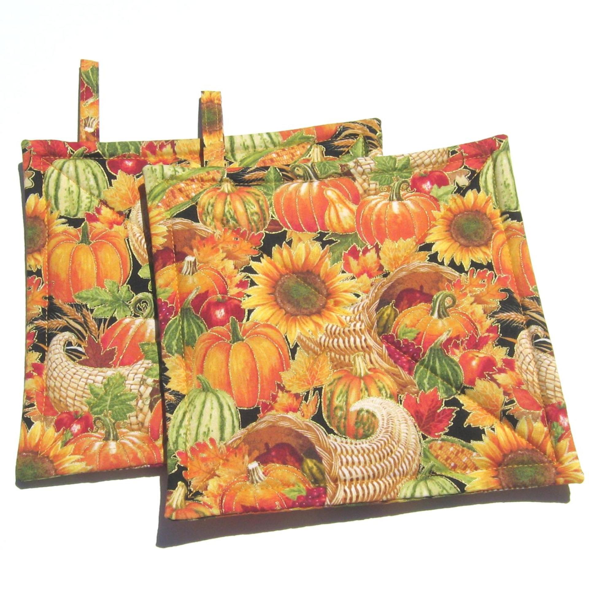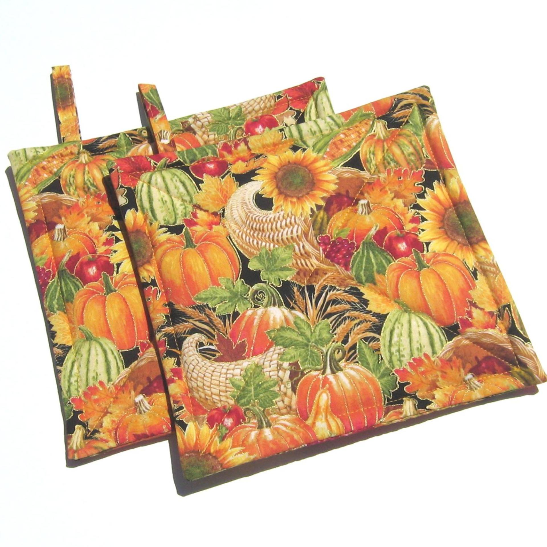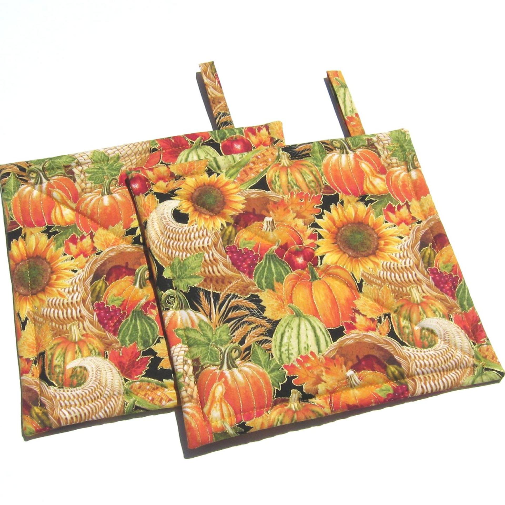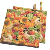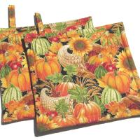 Golden harvest potholders, featuring a cornucopia of pumpkins, apples, wheat, corn, grapes and sunflowers in shades of red, orange, yellow and green with delicate gold tracery, all on a black background. Perfect for your own fall kitchen, also makes a very nice housewarming or hostess gift.