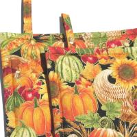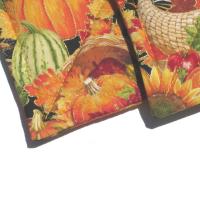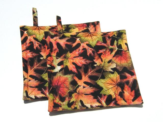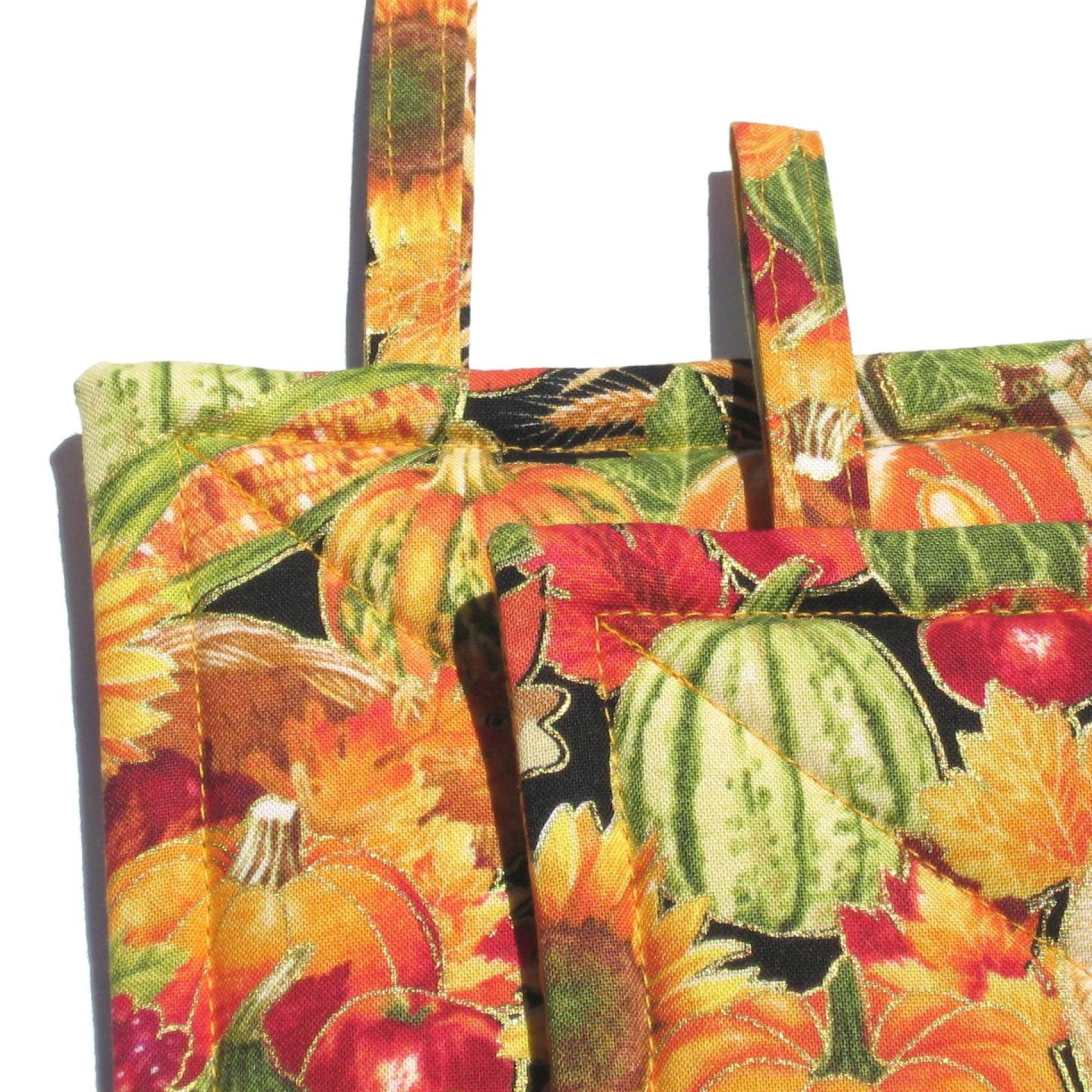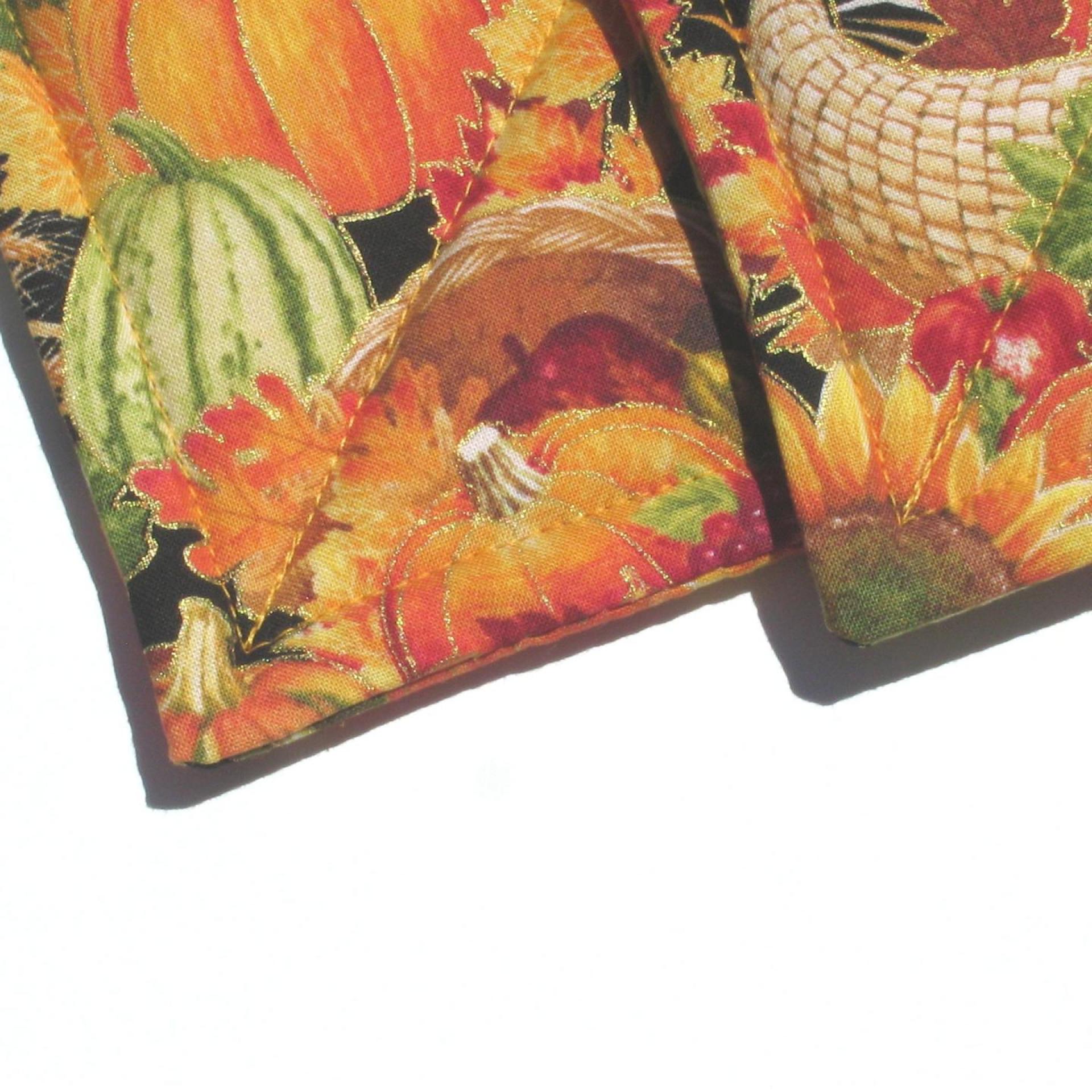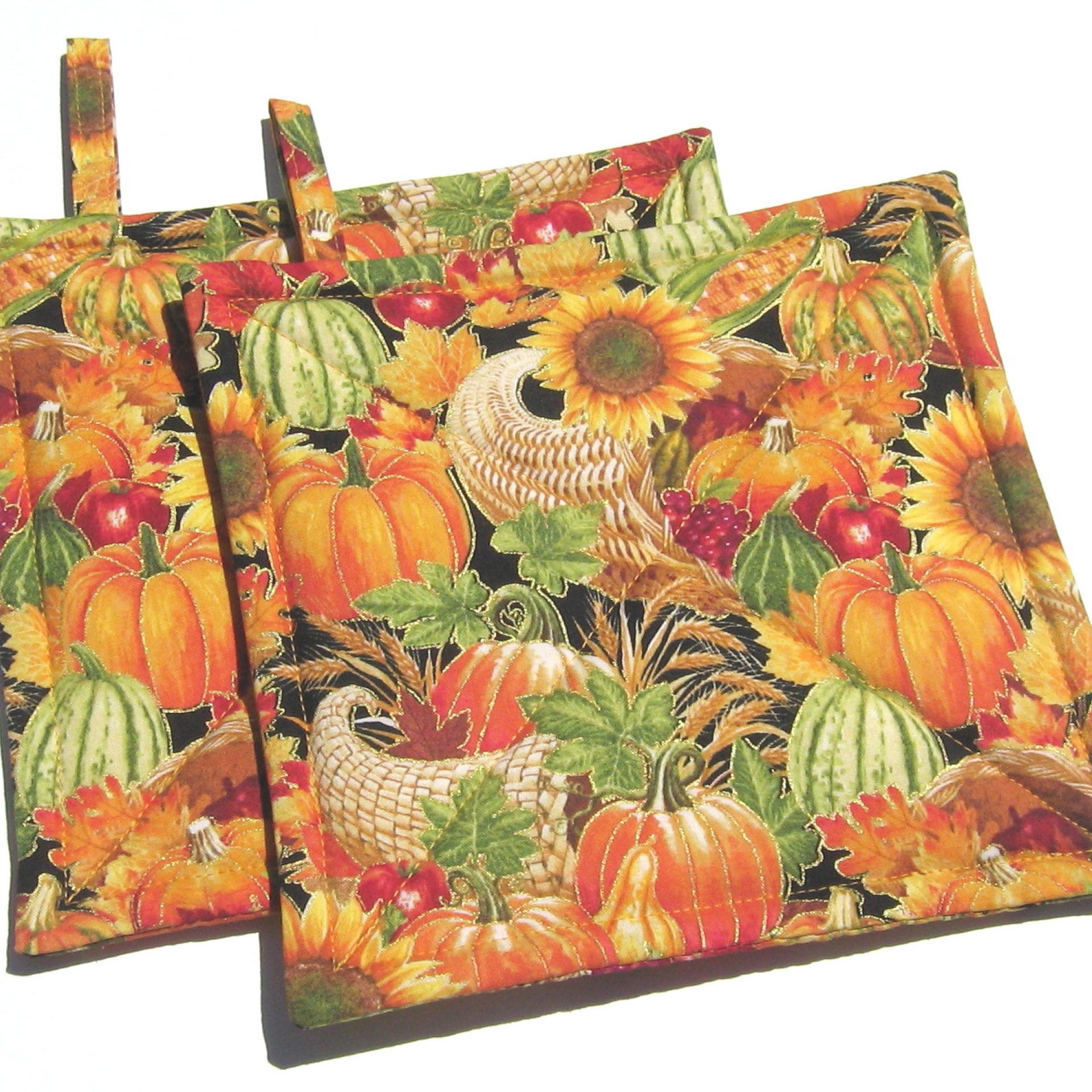 Golden harvest potholders, featuring a cornucopia of pumpkins, apples, wheat, corn, grapes and sunflowers in shades of red, orange, yellow and green with delicate gold tracery, all on a black background. Perfect for your own fall kitchen, also makes a very nice housewarming or hostess gift.