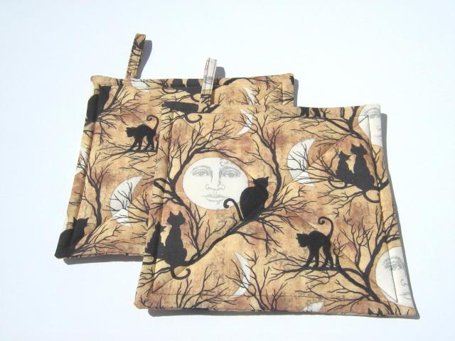 Set of two handmade hot pads, approx. 8 x 8 inches, made of premium quality cotton; filling consists of one layer Insul-Bright reflective metallic padding, plus a layer of cotton batting. Same fabric on both sides.