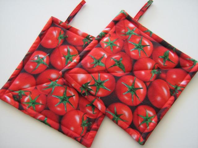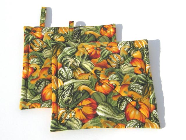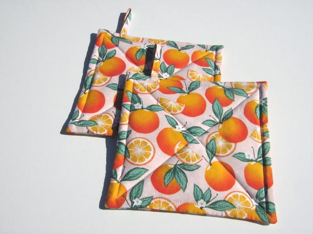 Set of two handmade hot pads, approx. 8 x 8 inches, made of premium quality cotton; filling consists of one layer Insul-Bright reflective metallic padding, plus a layer of cotton batting. Same fabric on both sides.