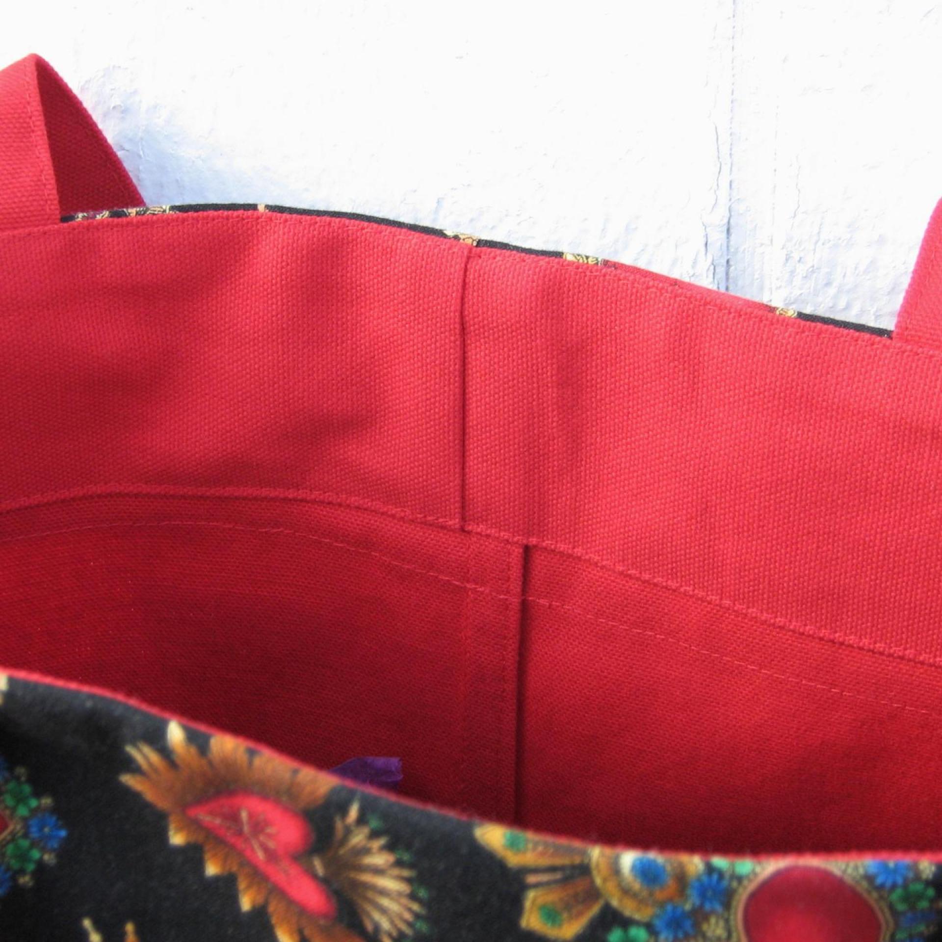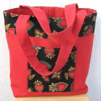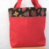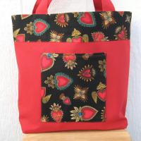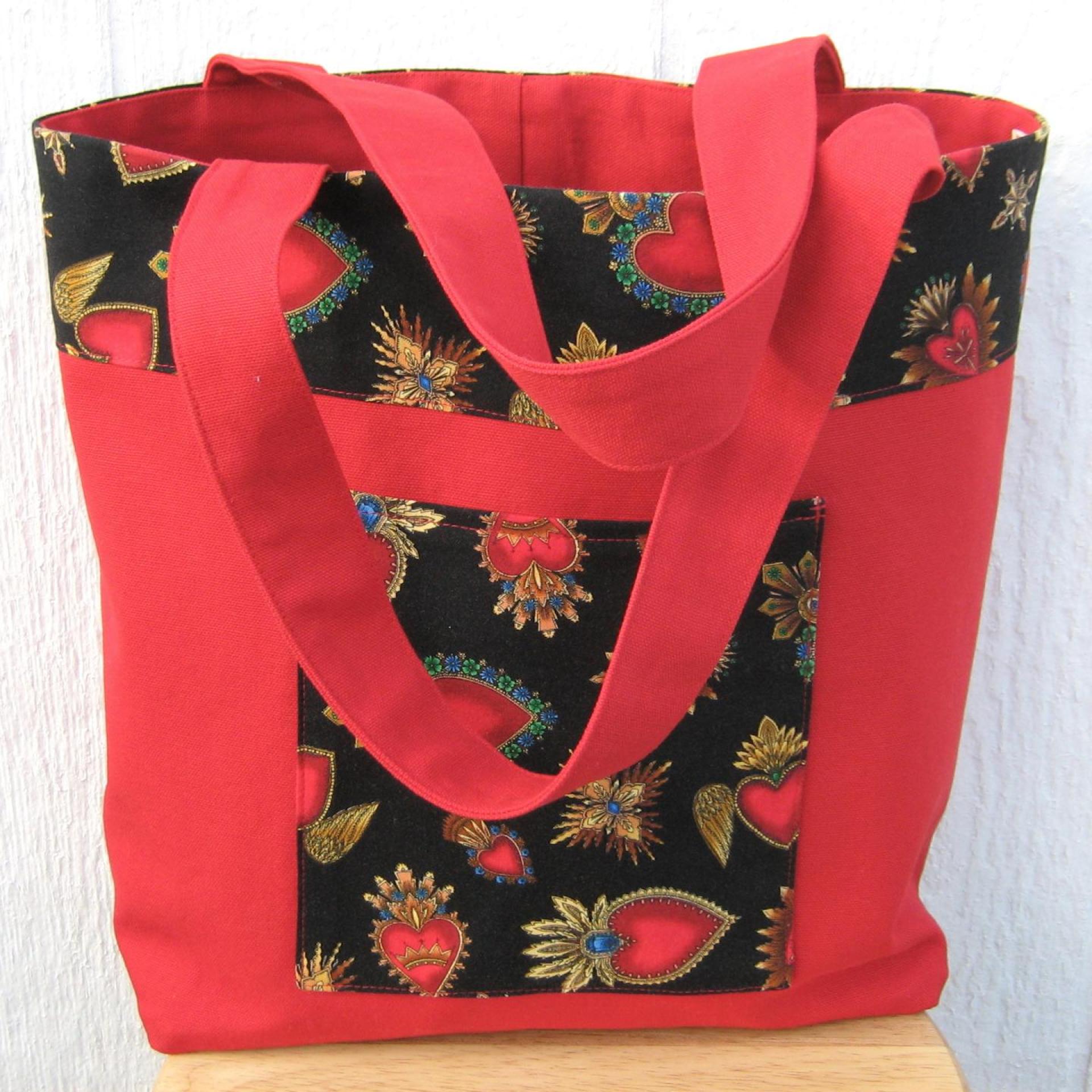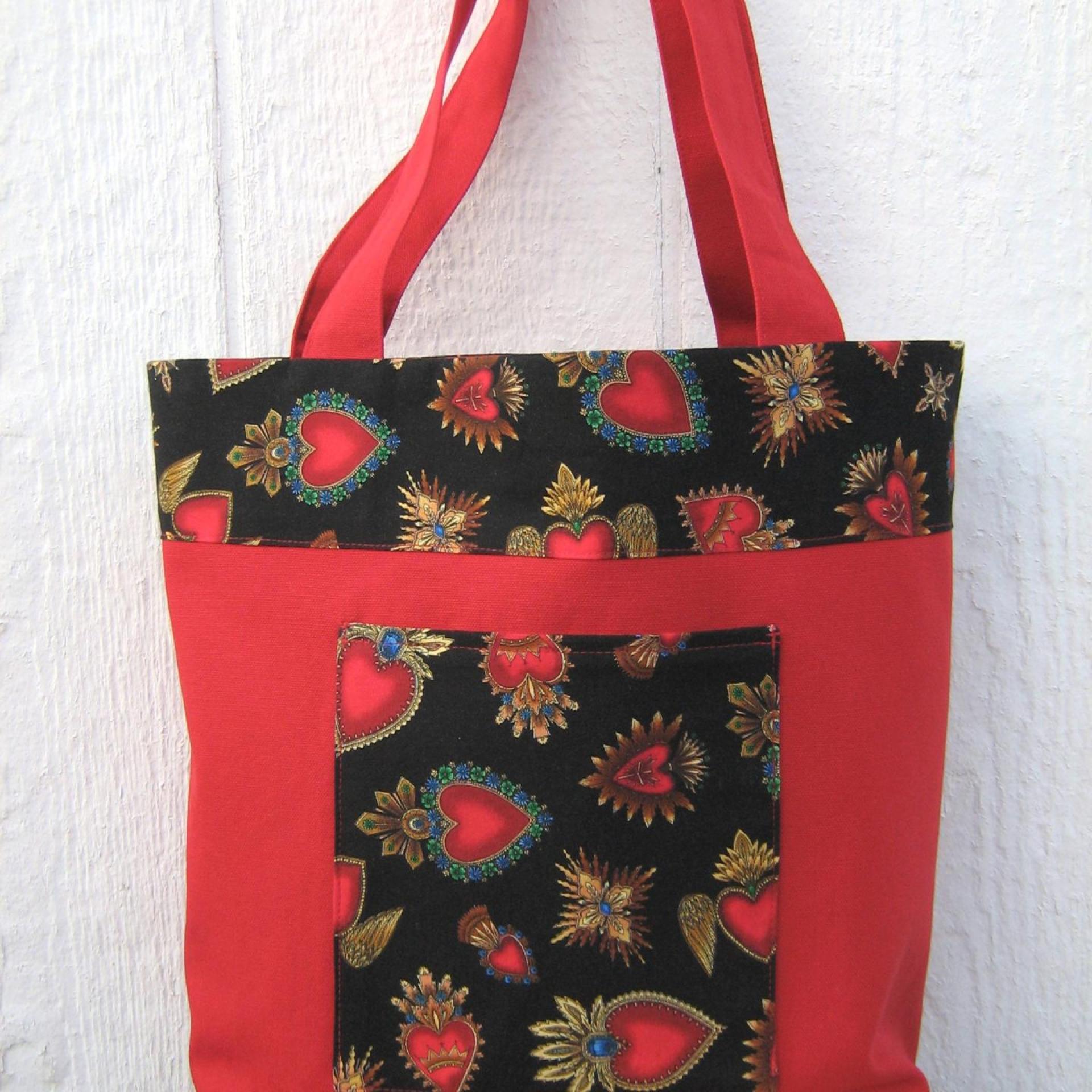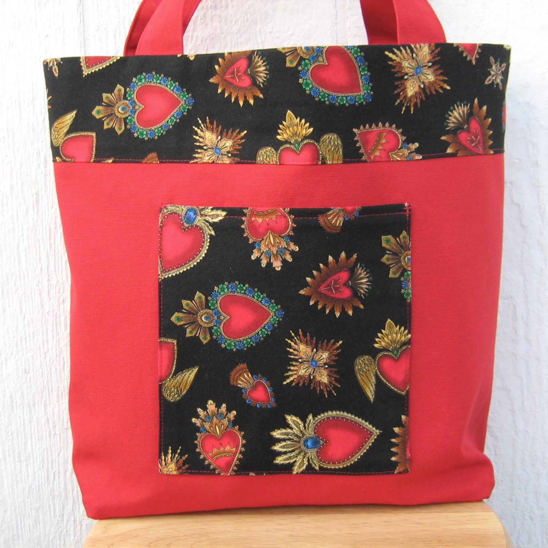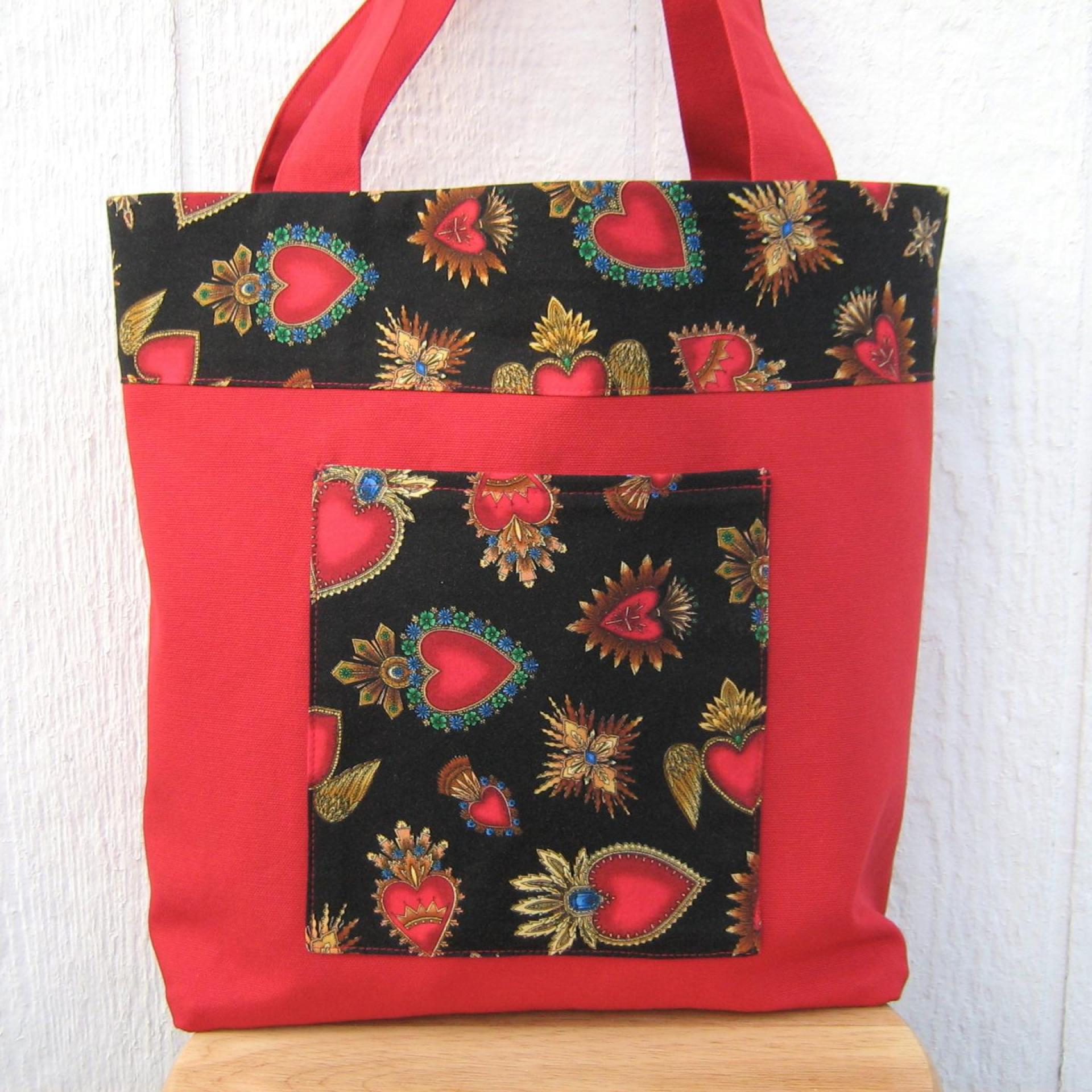 Red duck cloth canvas tote bag, featuring an outside patch pocket and upper edge trim of Day of the Dead sacred hearts on a black background; it is suitable for a load of shopping, a trip to the library, or any time a sturdy bag is called for. Also makes a great gift for those who take their own bags to the grocery store.