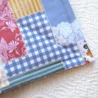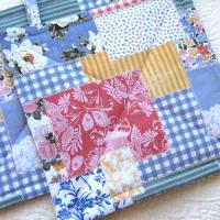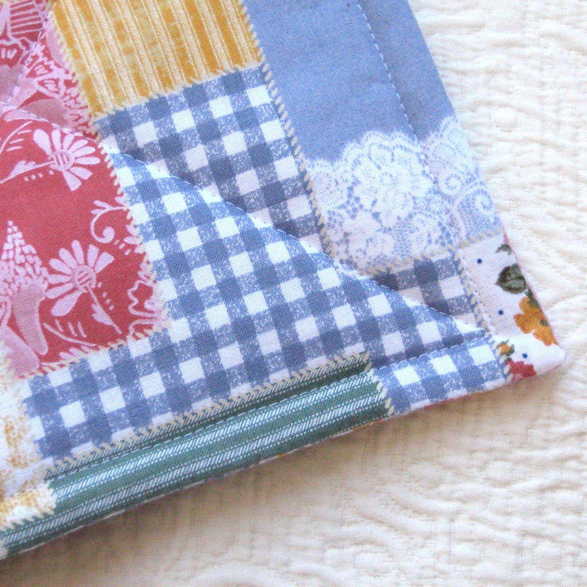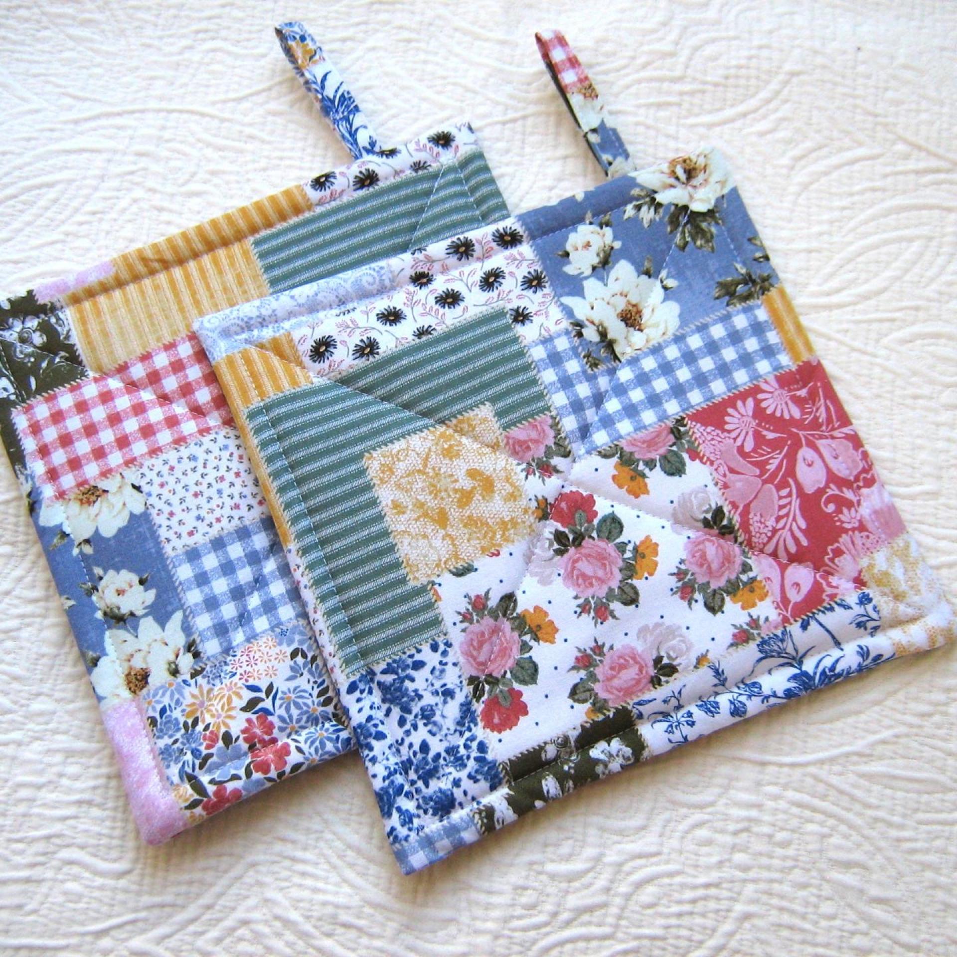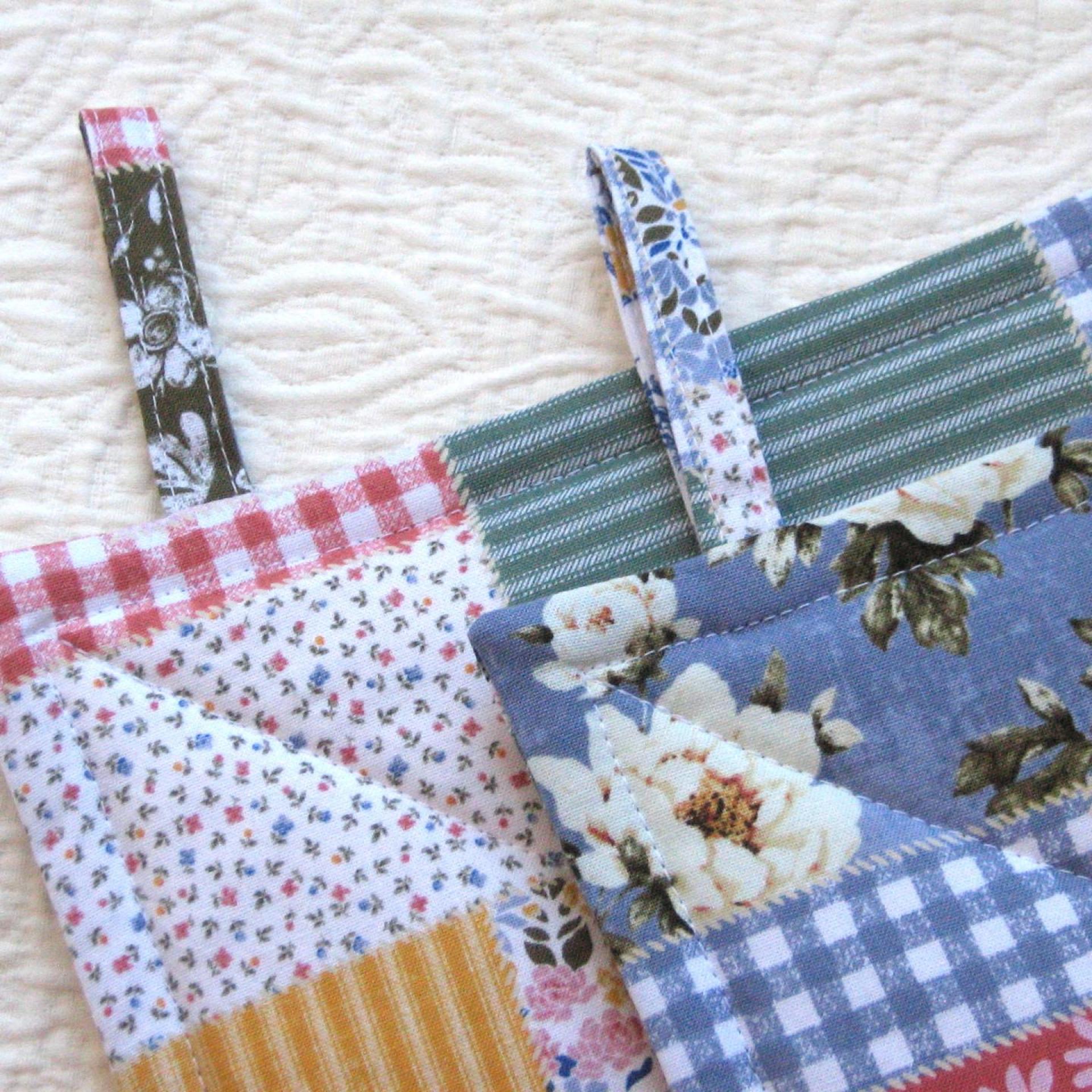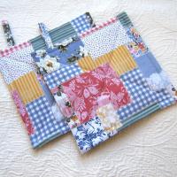Quilted faux patchwork potholders with an assortment of pink, green, yellow, blue and white "patches" featuring floral, gingham and striped designs reminiscent of vintage flour sack fabrics. Fresh and bright for spring and summer, they are sure to bring a cheery pop of color into any kitchen.