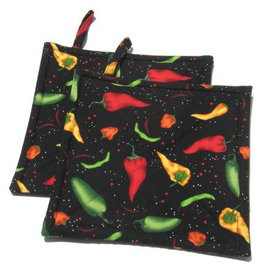 Set of two handmade potholders, approx. 8 x 8 inches, made of premium quality cotton; filling consists of one layer Insul-Bright reflective metallic padding, plus a layer of cotton batting. Same fabric front and back. Wash cool, dry low.