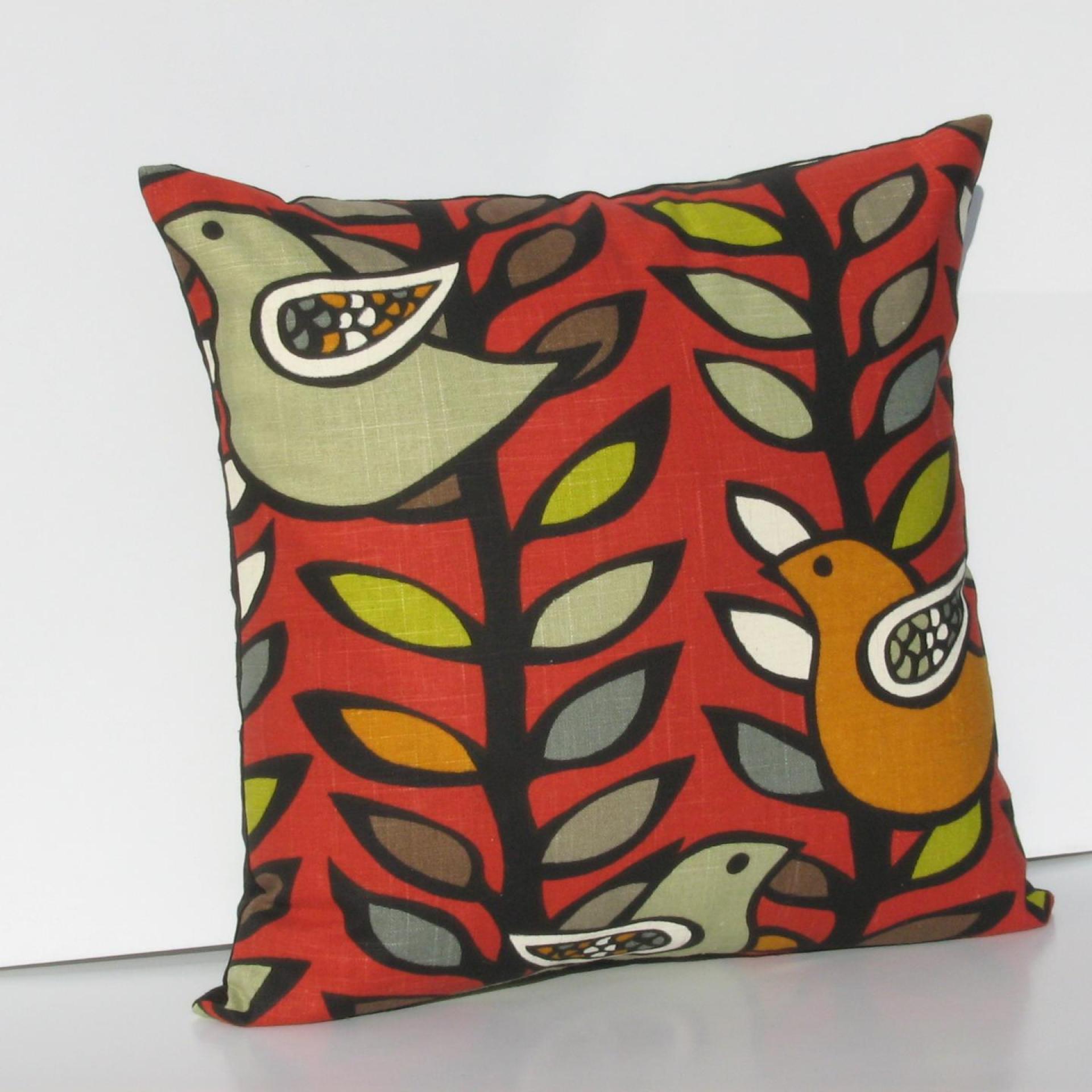 Fabric is a fabulous mid-century-modern style home décor slub cotton/linen blend, in lipstick red, with stylized birds and leaves in burnt orange, pale sage, chartreuse, hazelnut, slate blue, light grey and white, all outlined in rich black. The back is a solid black rayon/linen blend. Sized for an 18 x 18 inch insert; invisible zipper in bottom seam.
