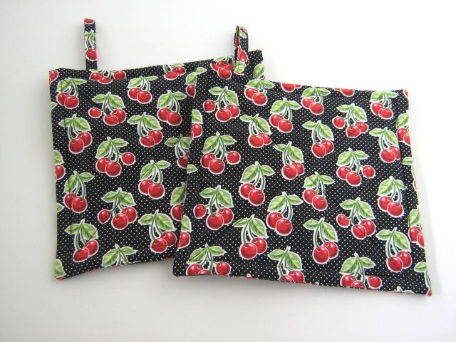 Set of two handmade potholders, approx. 8 x 8 inches, made of premium quality cotton; filling consists of one layer Insul-Bright reflective metallic padding, plus a layer of cotton batting. Wash cool, dry low.