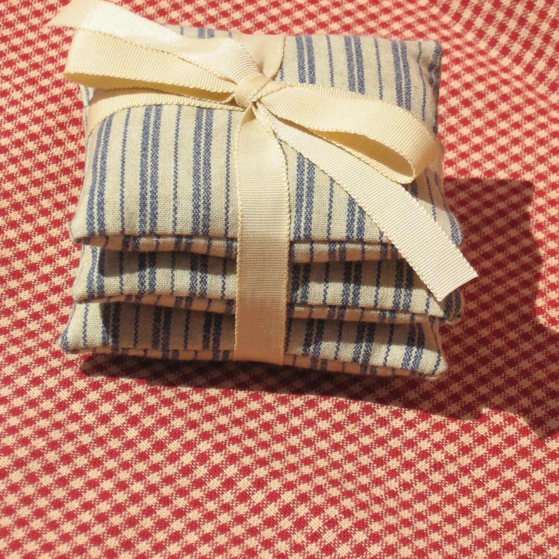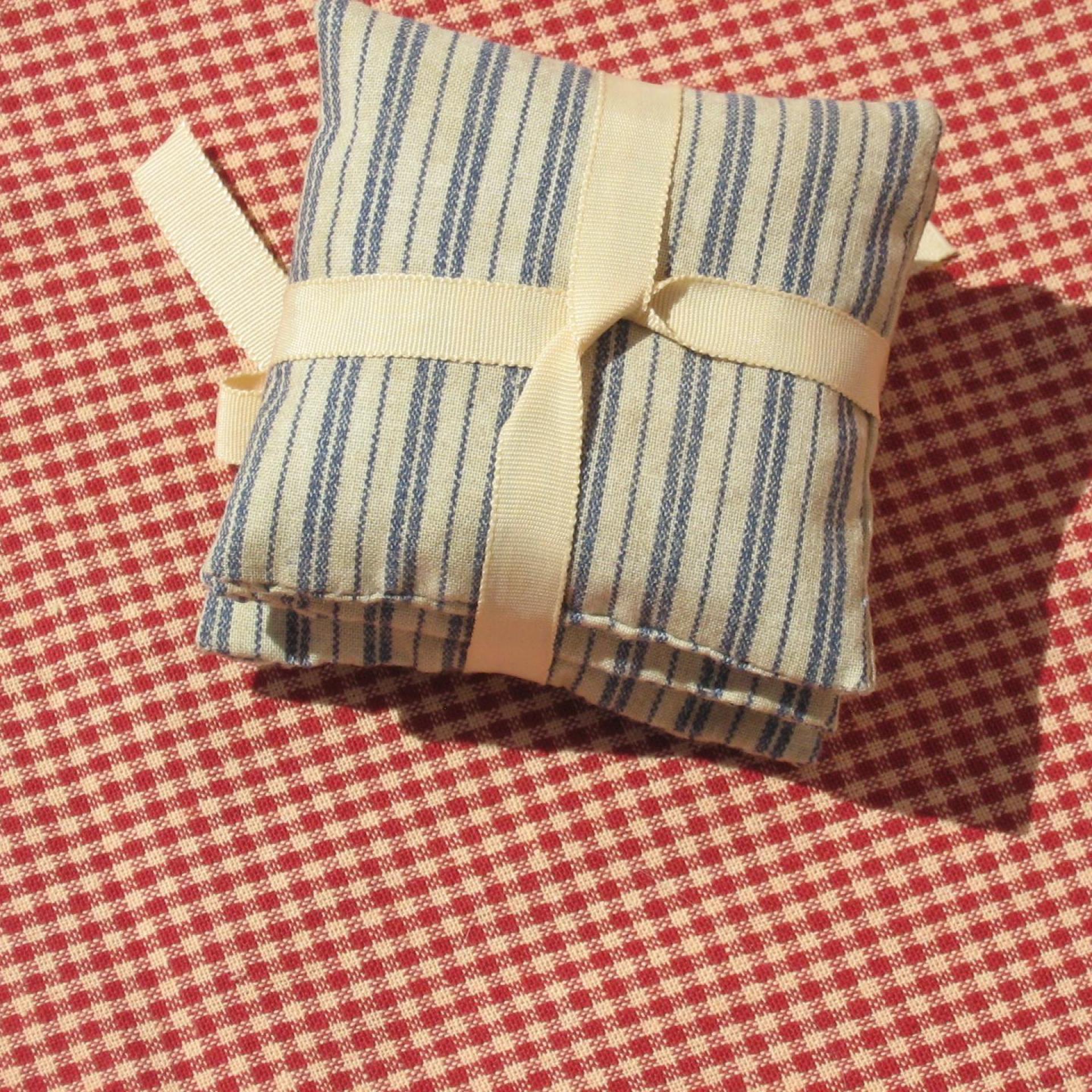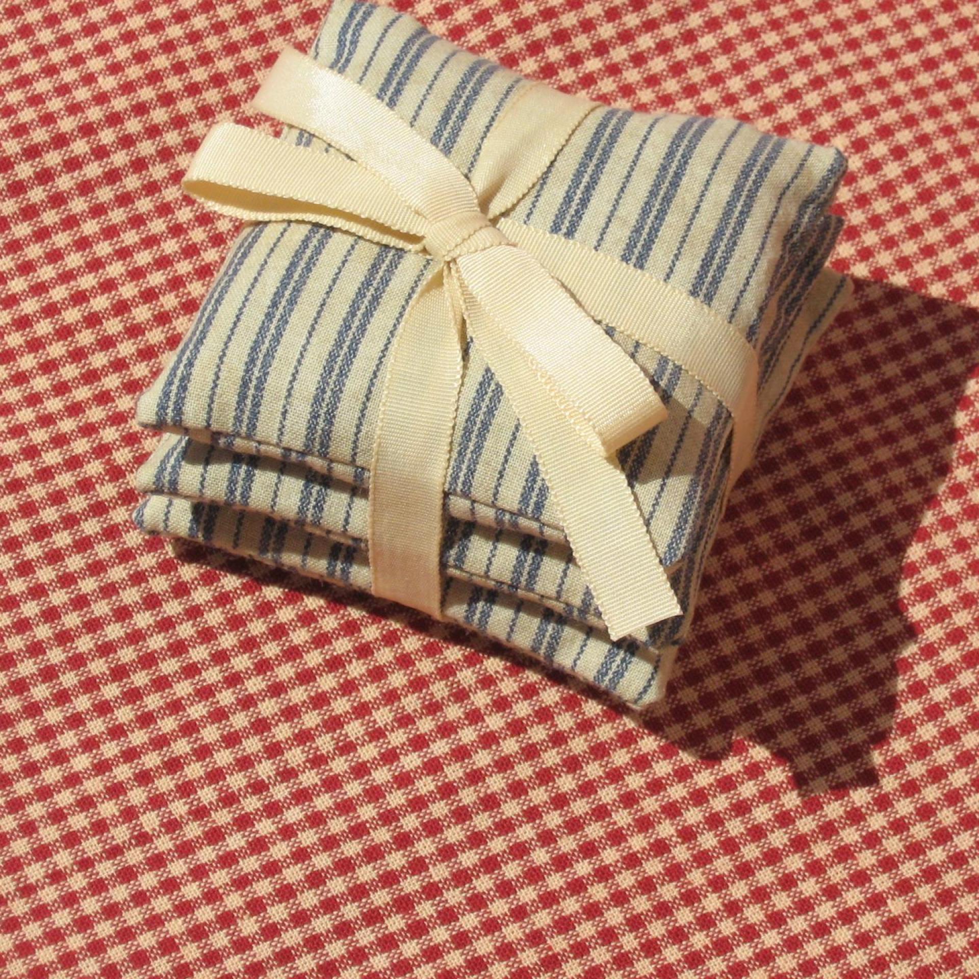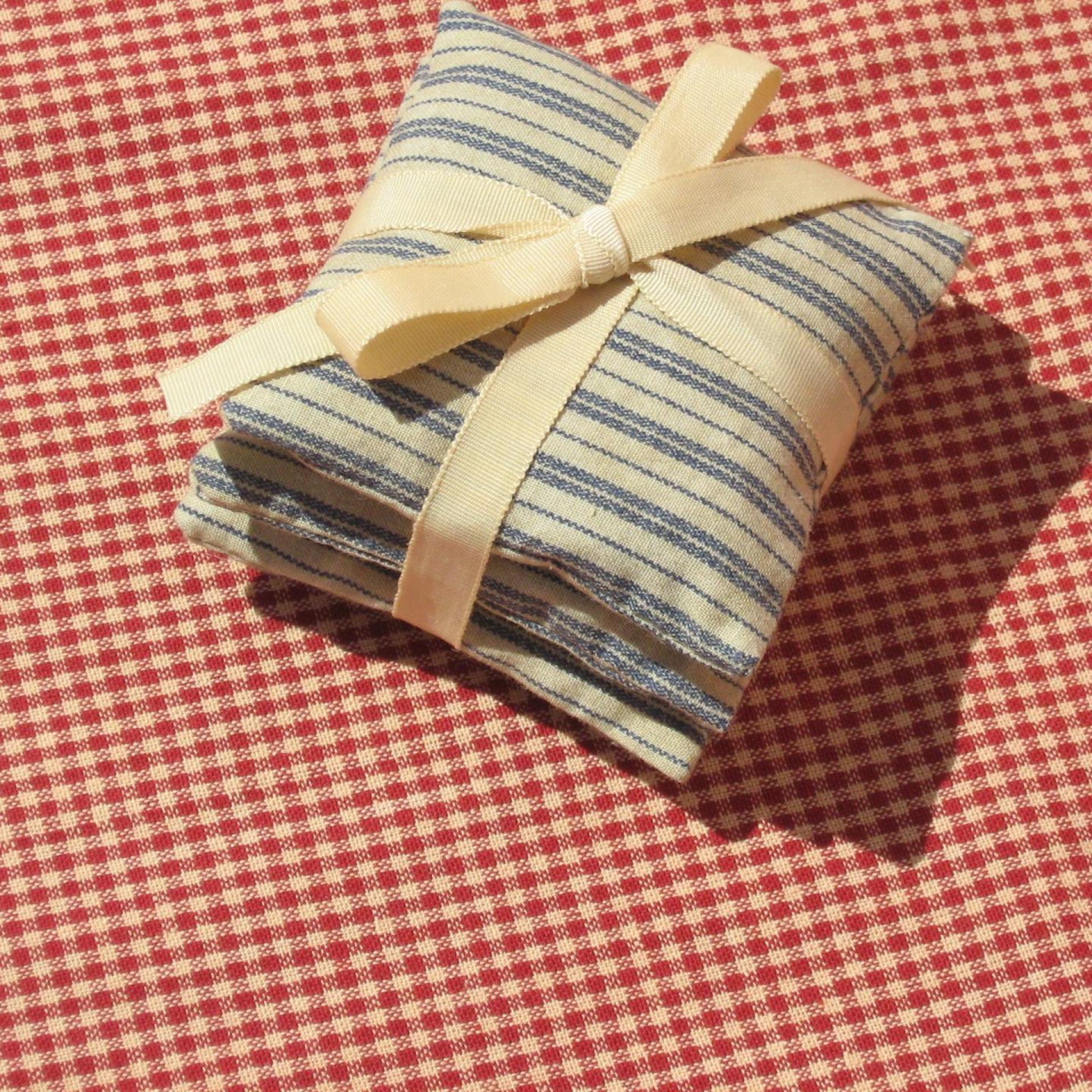 Lovely little lavender-filled sachets, set of 3 in a vintage-look cotton print, featuring an antique style blue and tan ticking stripe, and all wrapped up with a pale-yellow vintage ribbon.