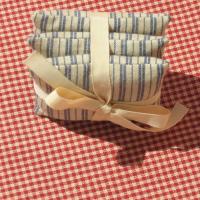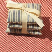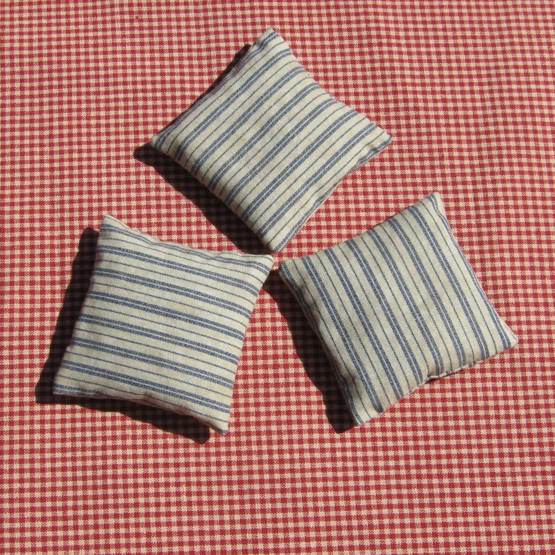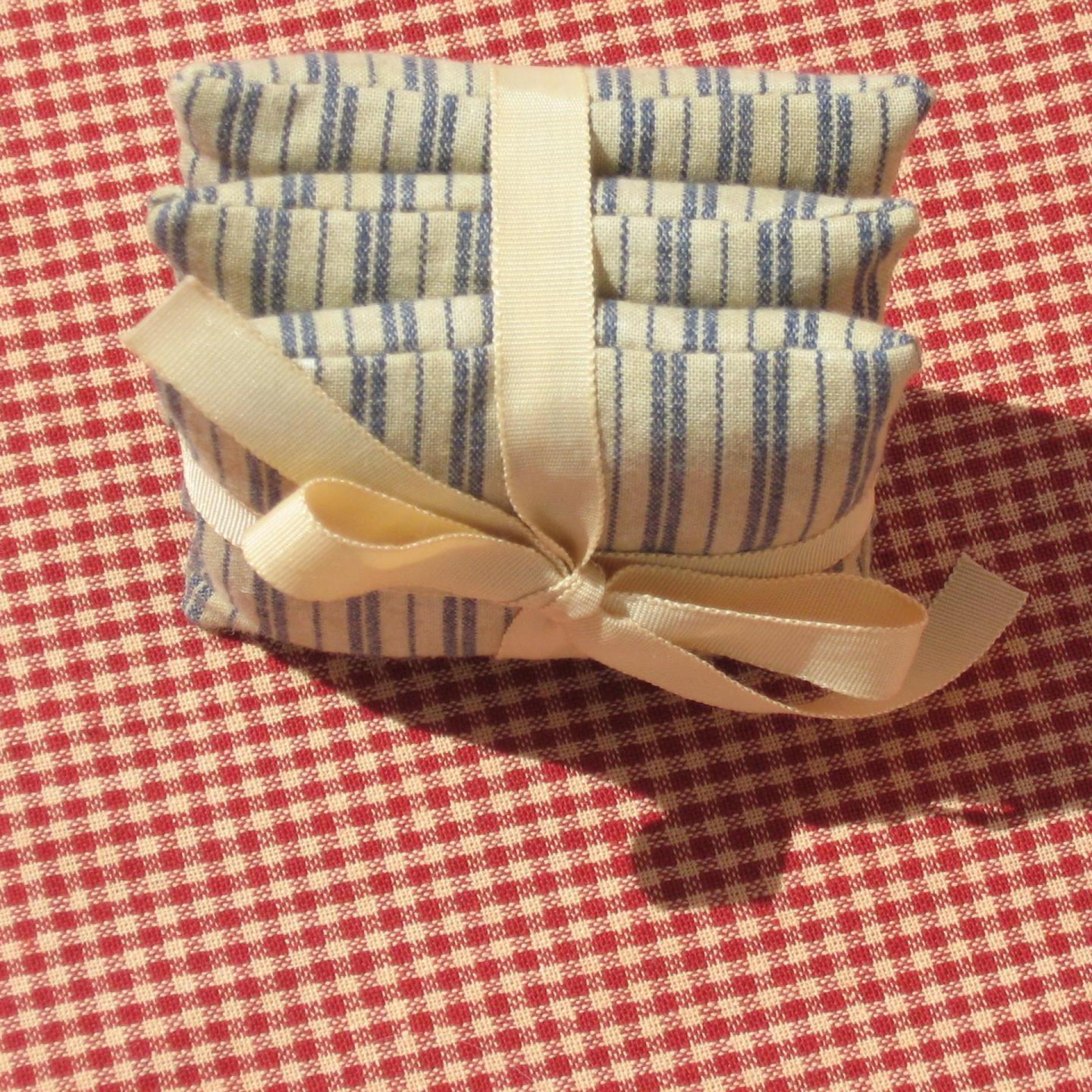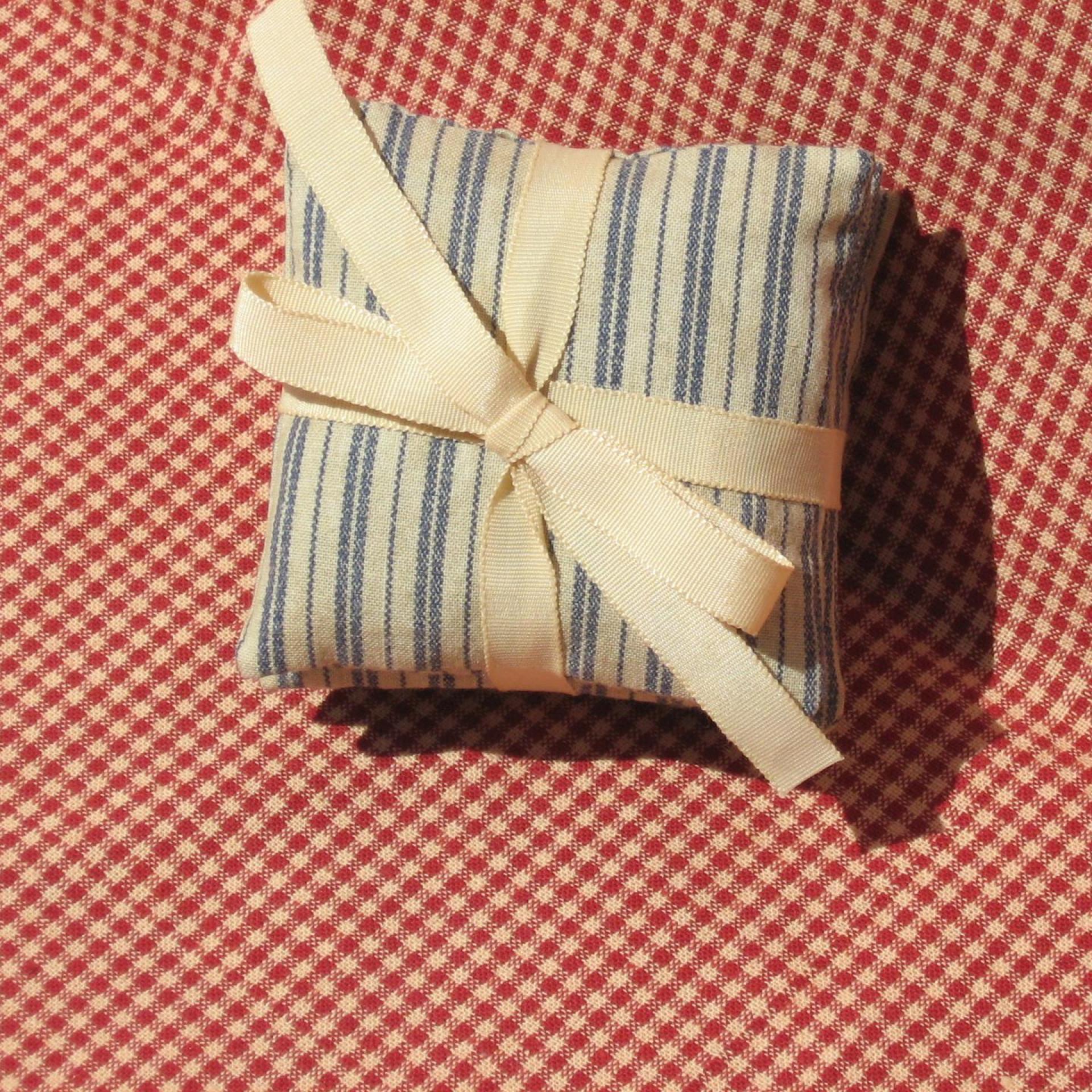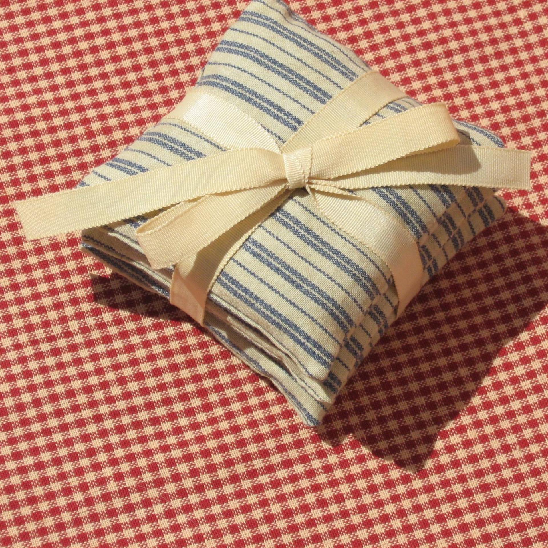 Lovely little lavender-filled sachets, set of 3 in a vintage-look cotton print, featuring an antique style blue and tan ticking stripe, and all wrapped up with a pale-yellow vintage ribbon.