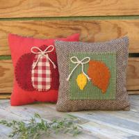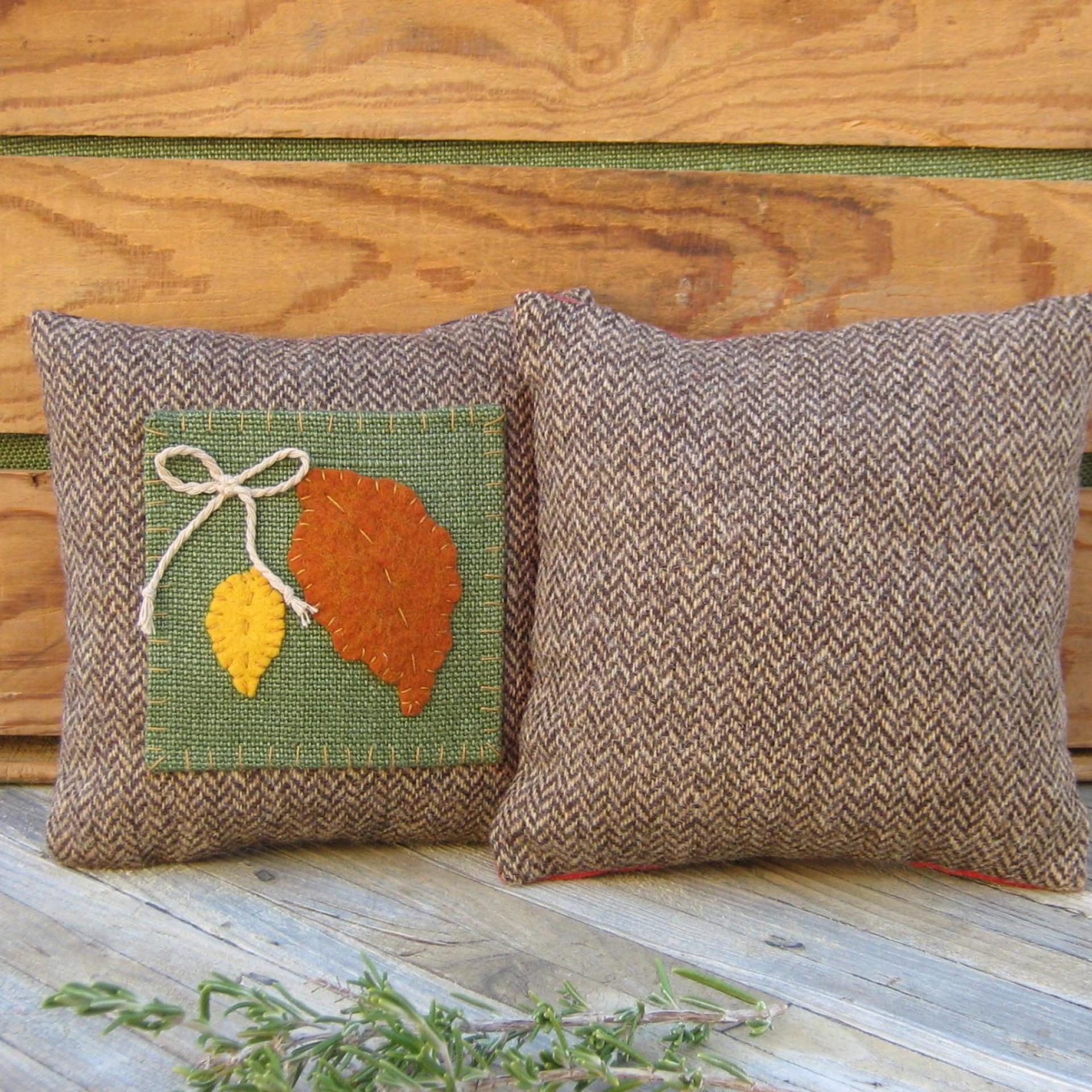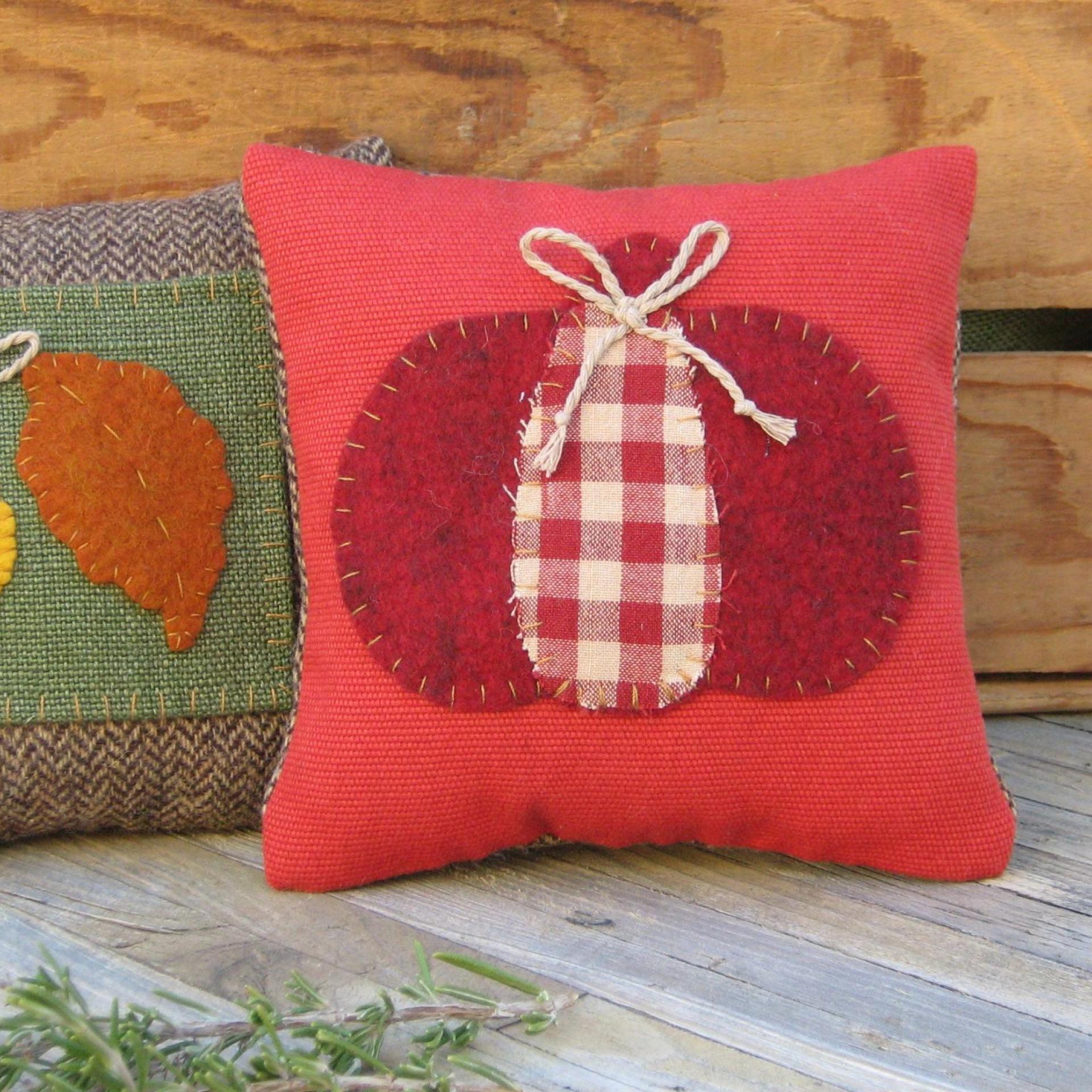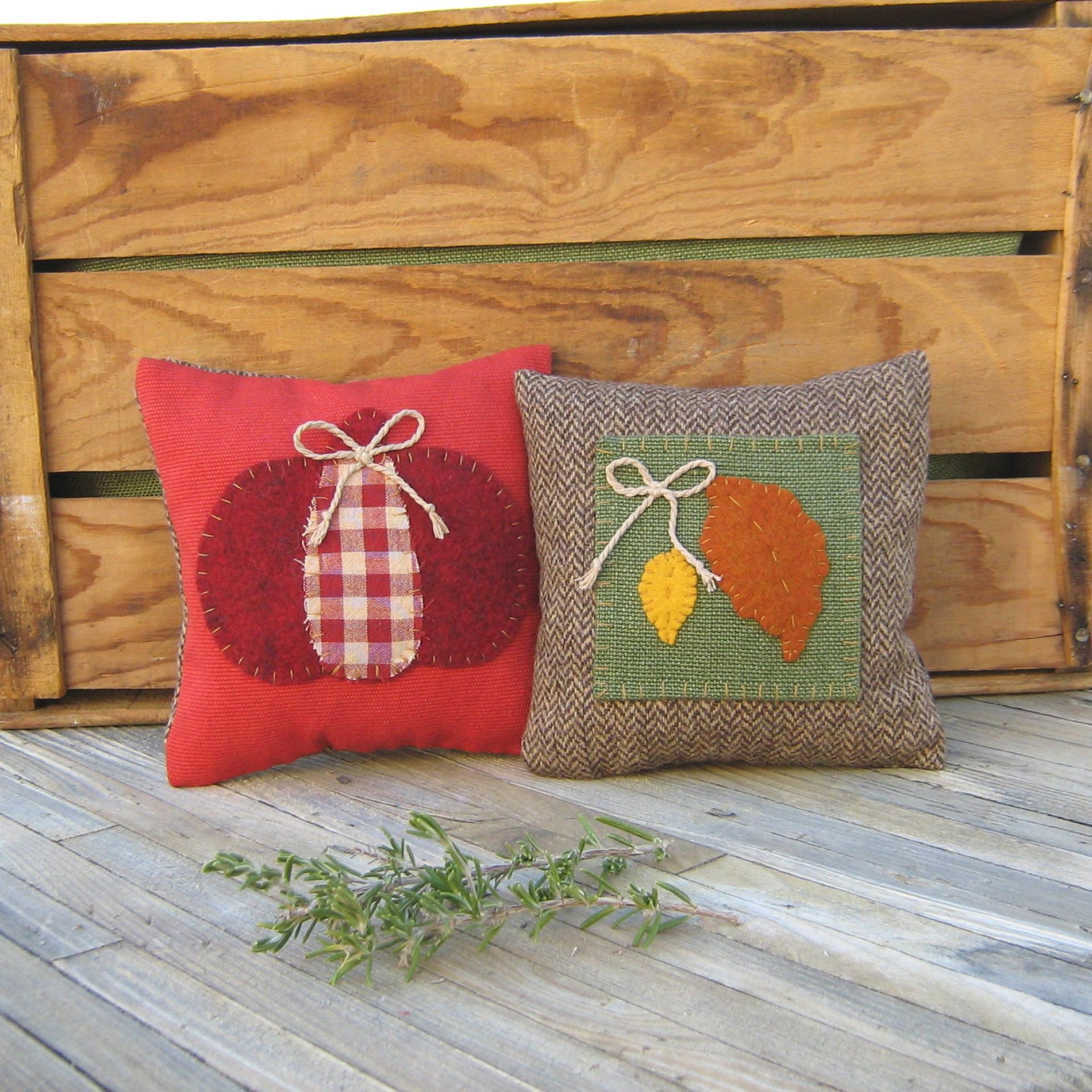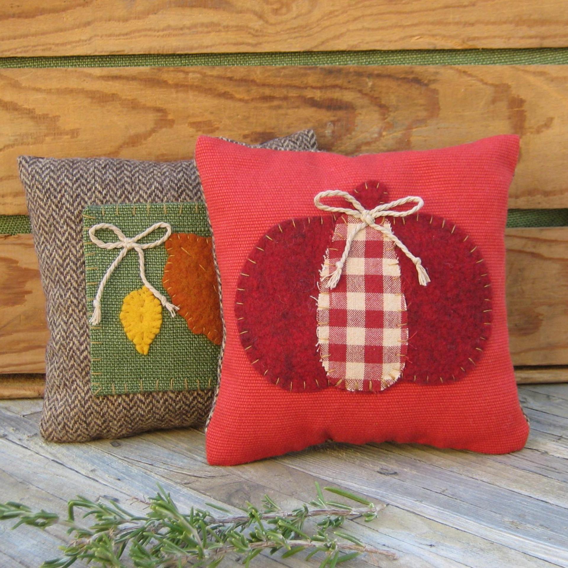 Two mini pillows, one with falling autumn leaves in gold and burnt orange on a patch of green burlap, and the other with a big pumpkin in red felt and red check homespun on a background of tomato red duck cloth, all stitched on by hand, and finished with a small bow in neutral cotton string.