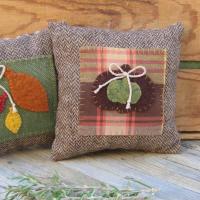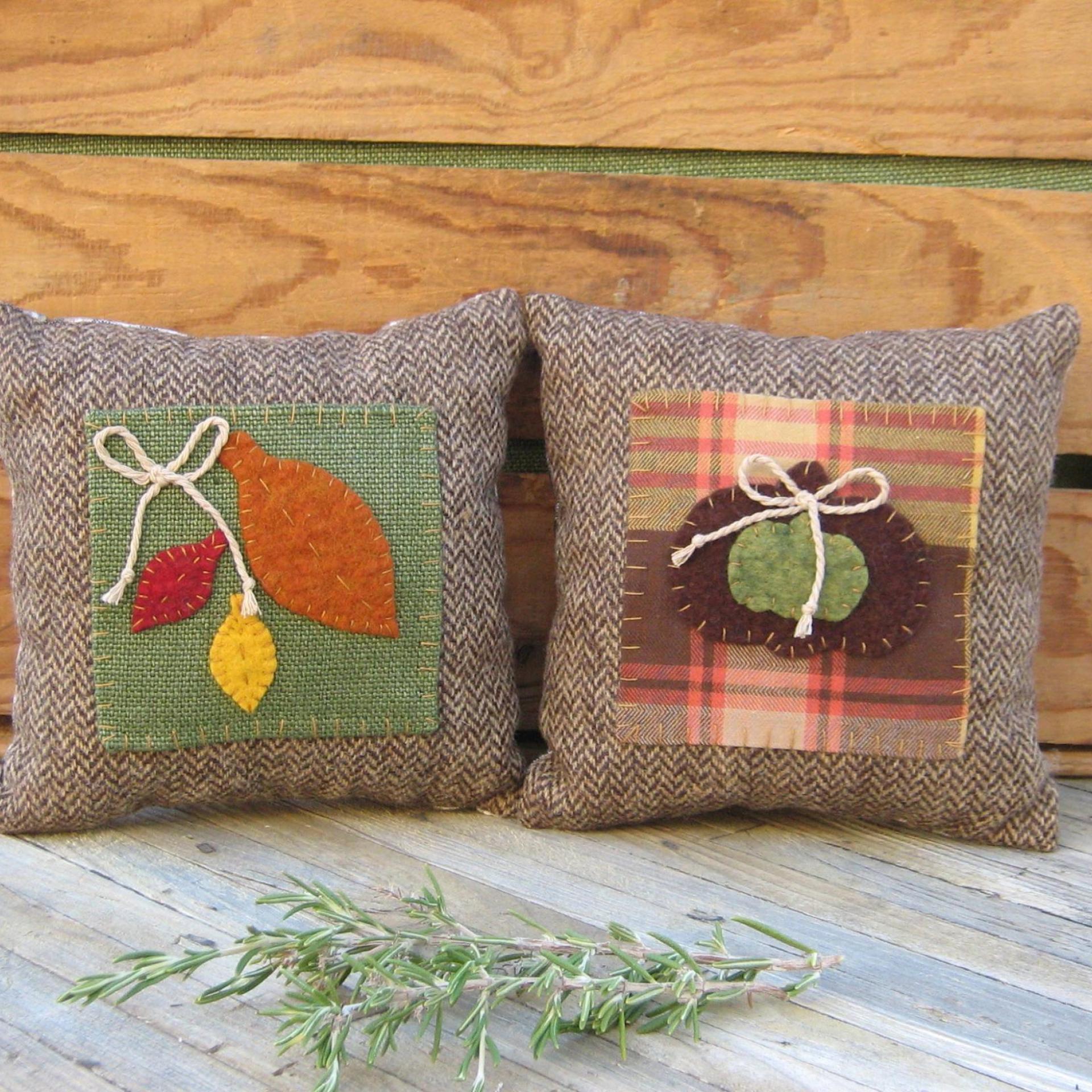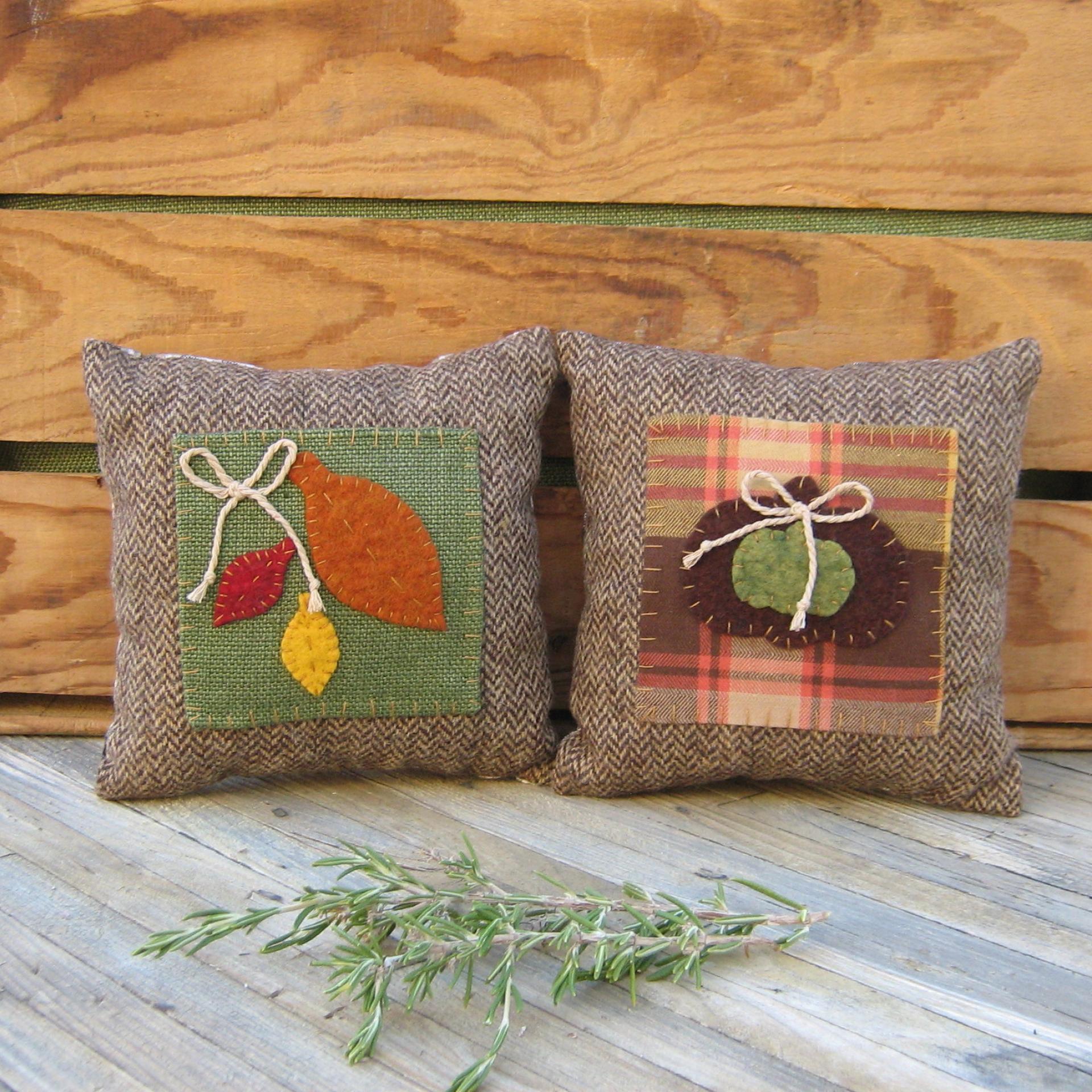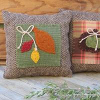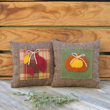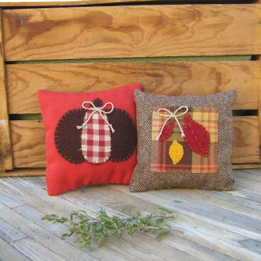 Two tiny pillows, one with falling autumn leaves in red, gold and burnt orange on a patch of green burlap, the other with pumpkins in green and brown on a patch of fall-hued plaid, all stitched on by hand, and finished with a small bow in neutral cotton string.