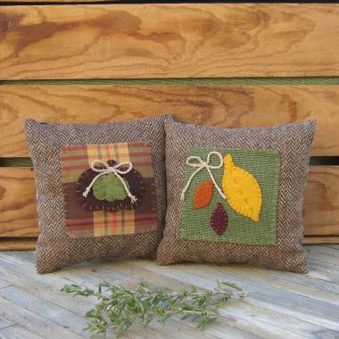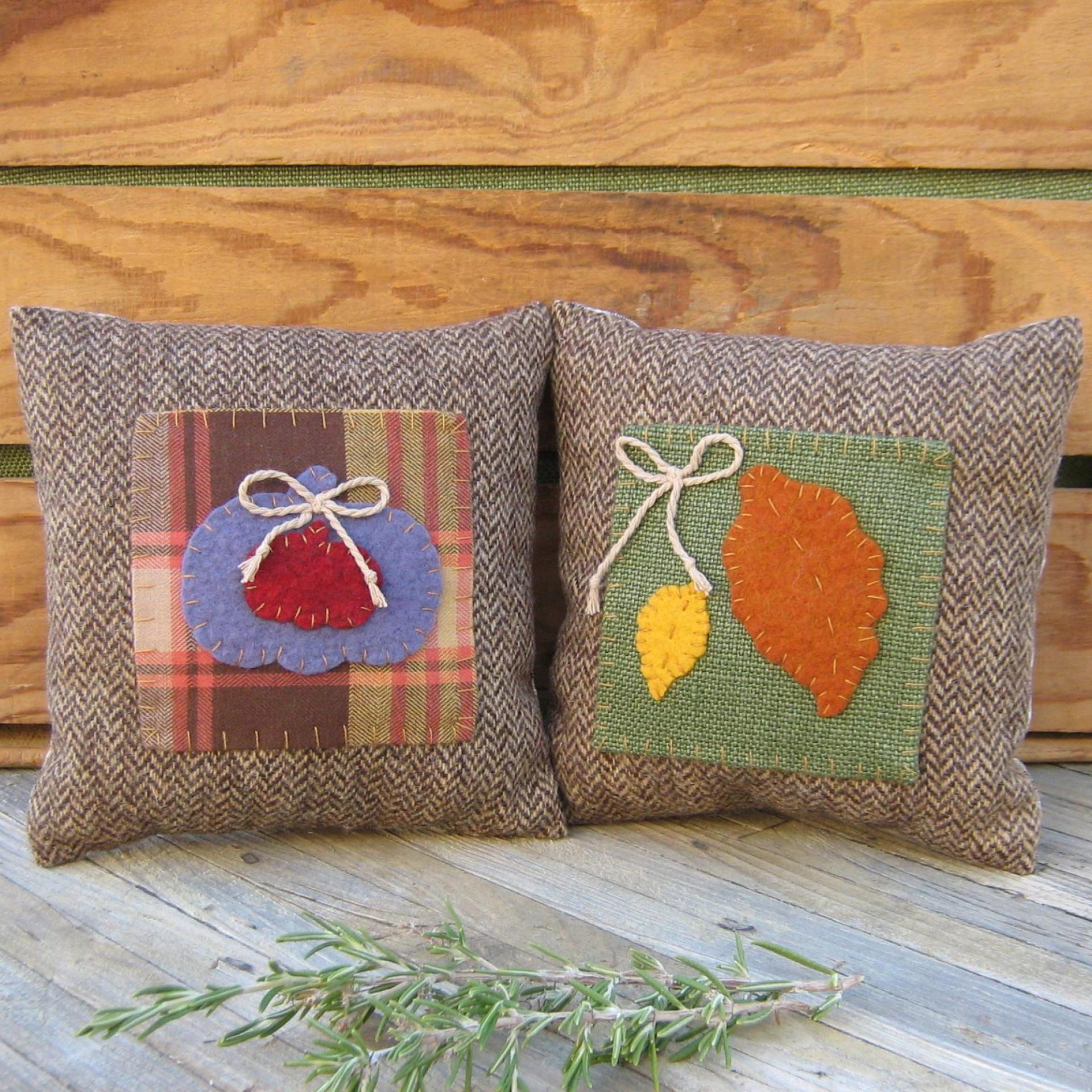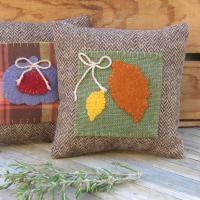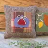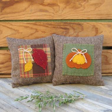 Two tiny pillows, one with falling autumn leaves in gold and burnt orange on a patch of green burlap, the other with pumpkins in red and purple on a patch of fall-hued plaid, all stitched on by hand, and finished with a small bow in neutral cotton string.