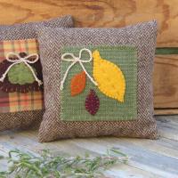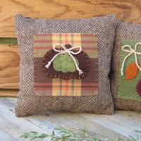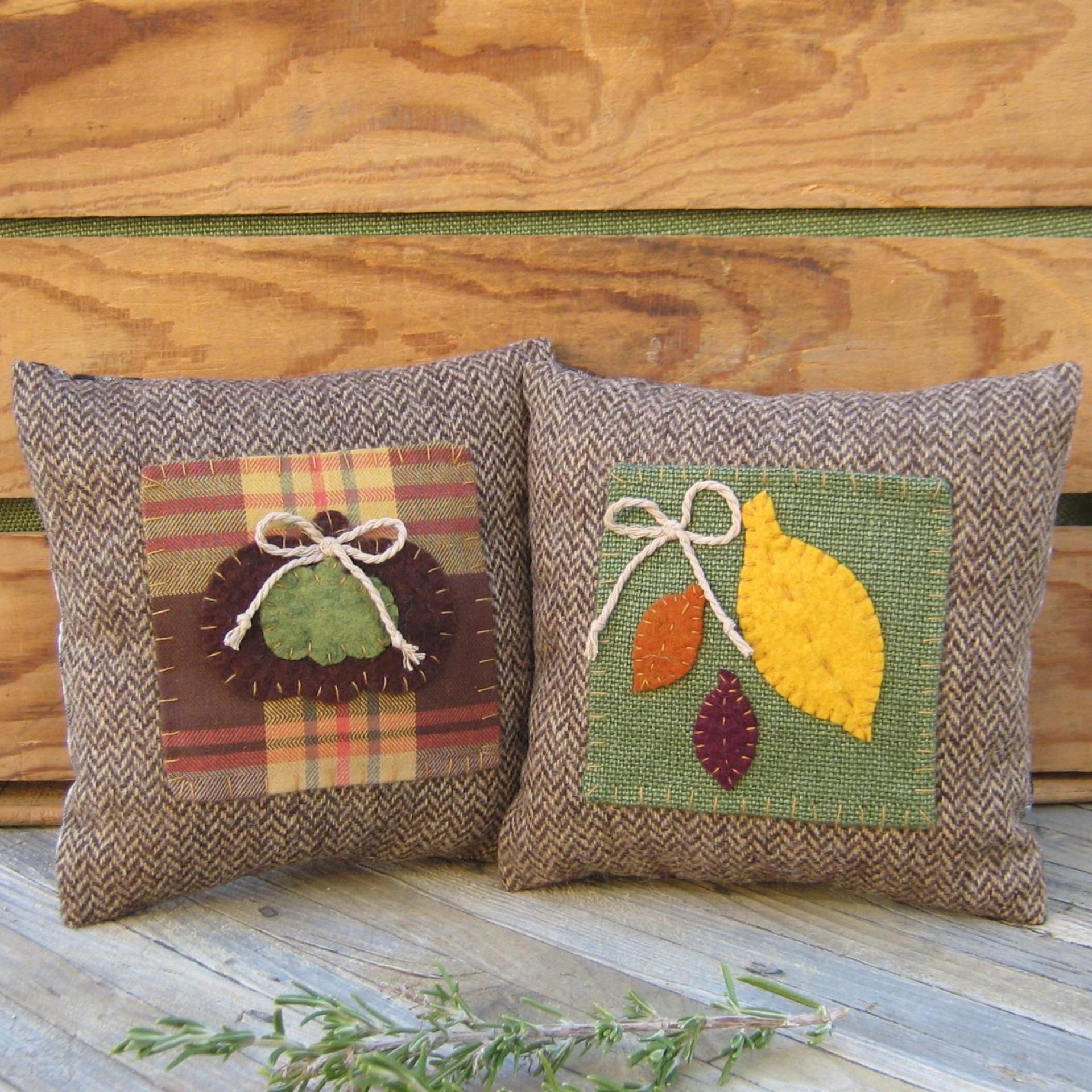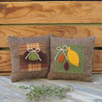 Two tiny pillows, one with falling autumn leaves in plum, gold and burnt orange on a patch of green burlap, the other with pumpkins in green and brown on a patch of fall-hued plaid, all stitched on by hand, and finished with a small bow in neutral cotton string.