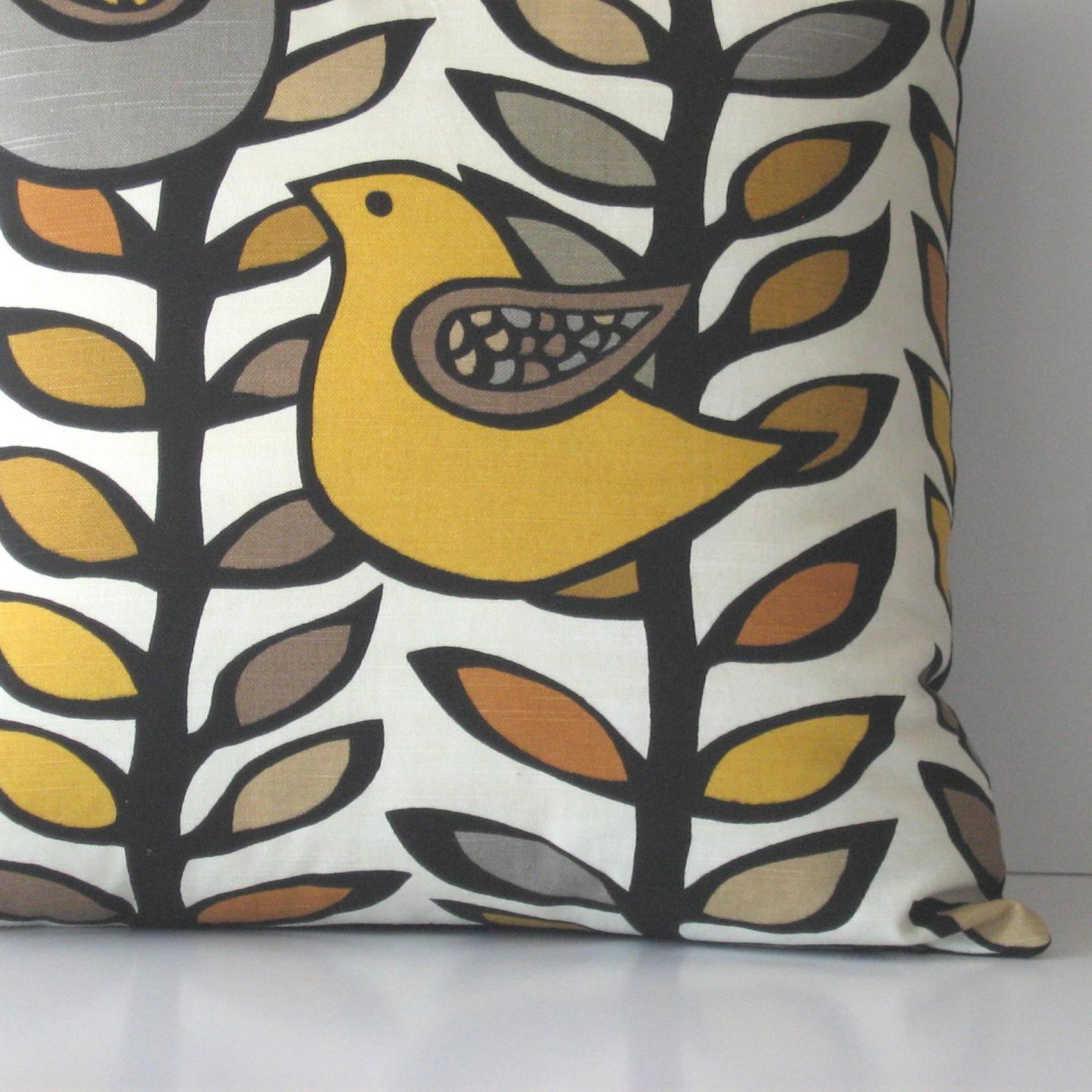 Fabric is a fabulous mid-century-modern style home décor slub cotton/linen blend in white, with stylized birds and leaves in gold, two shades of grey, light brown, burnt orange and latte, all outlined in rich black. The back is a solid black rayon/linen blend. Sized for a 20 x 20 inch insert; invisible zipper in bottom seam.