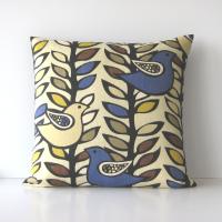 Fabric is a fabulous mid-century-modern style home décor slub cotton/linen blend, in oatmeal beige, with stylized birds and leaves in indigo blue, pale straw, mustard, cream, taupe and fawn, all outlined in rich black. The back is a solid black rayon/linen blend. Sized for a 22 x 22 inch insert, invisible zipper in bottom seam.