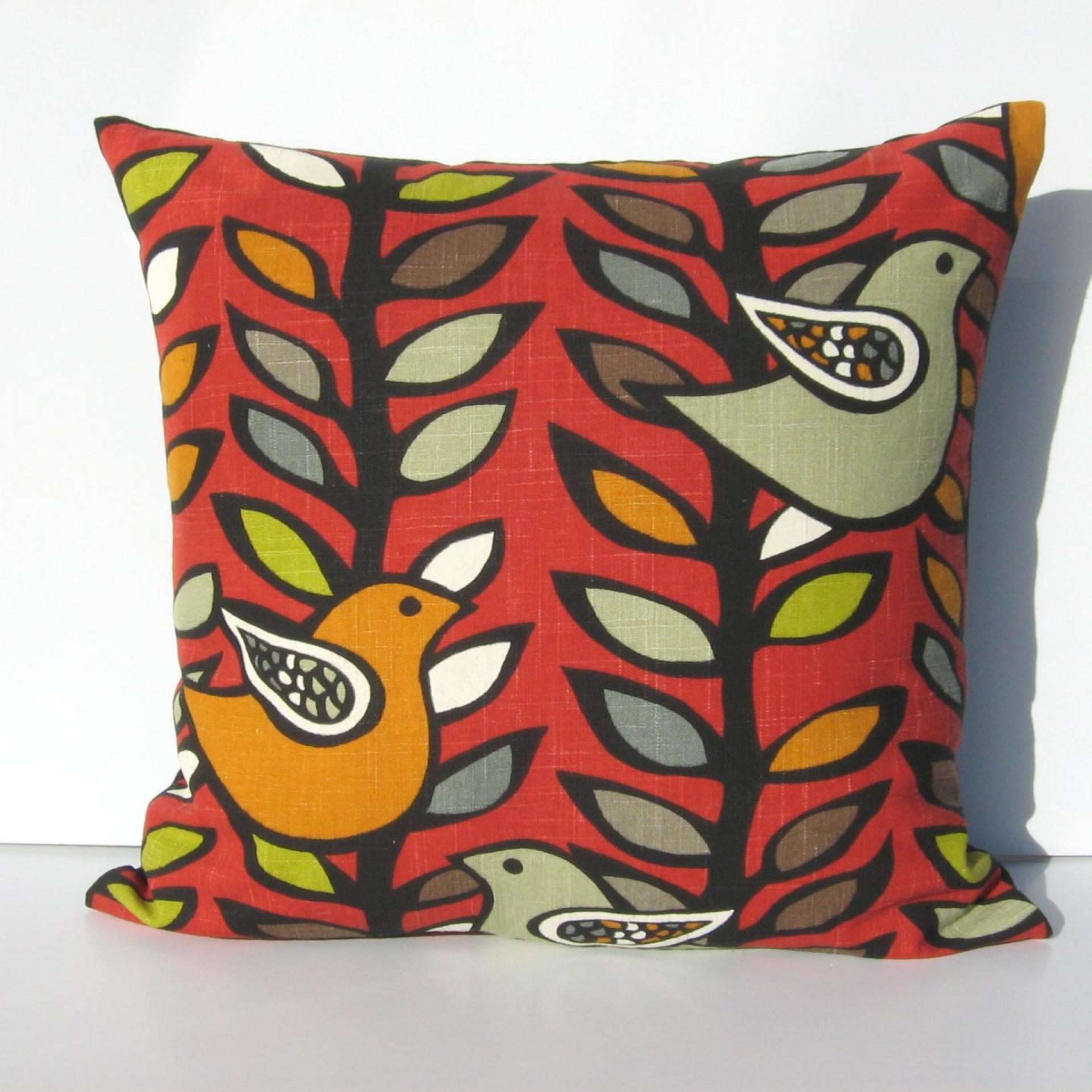 Fabric is a fabulous mid-century-modern style home décor slub cotton/linen blend in lipstick red, with stylized birds and leaves in burnt orange, pale sage, chartreuse, hazelnut, slate blue, light grey and white, all outlined in rich black. The back is a solid black rayon/linen blend. Sized for a 20 x 20 inch insert; invisible zipper in bottom seam.
