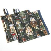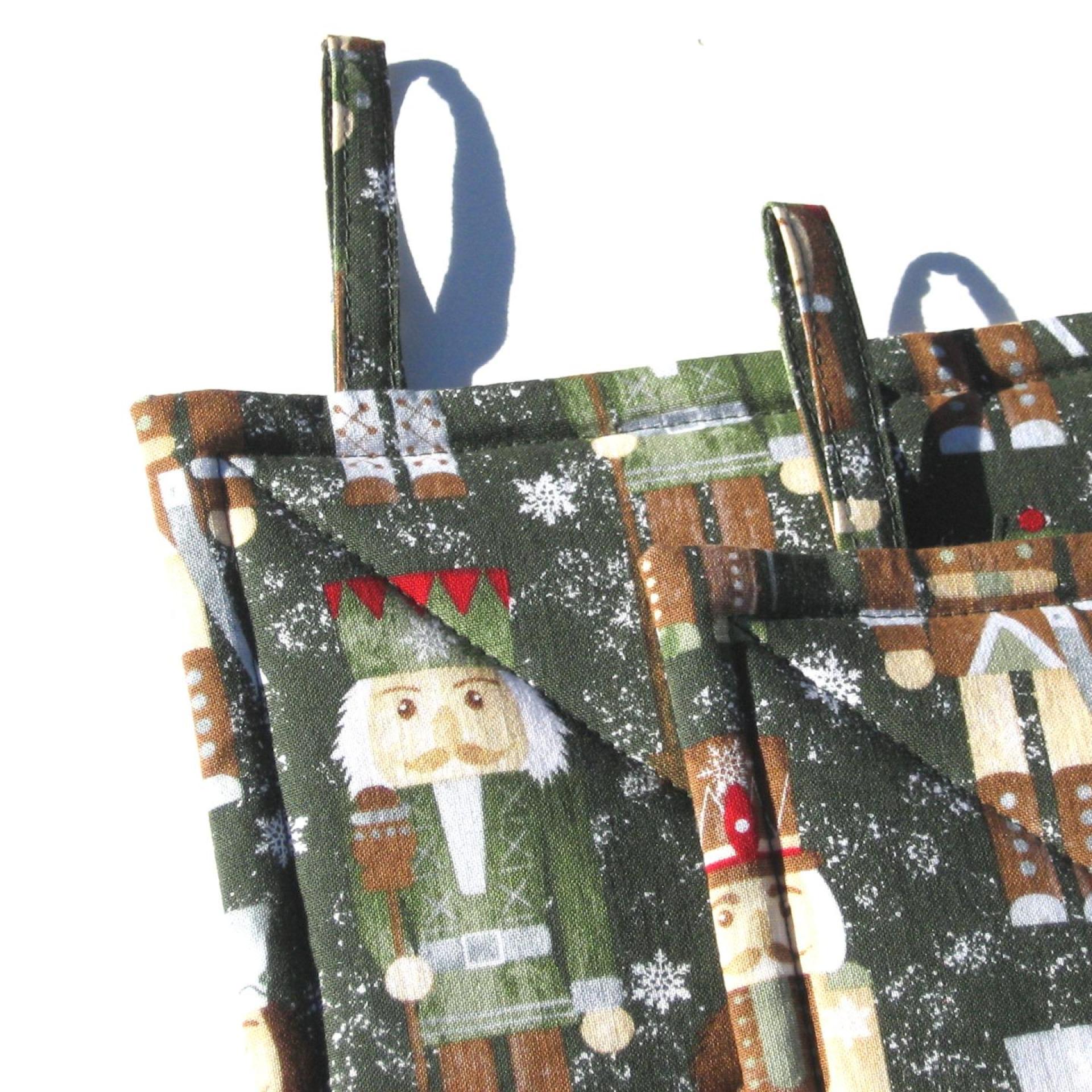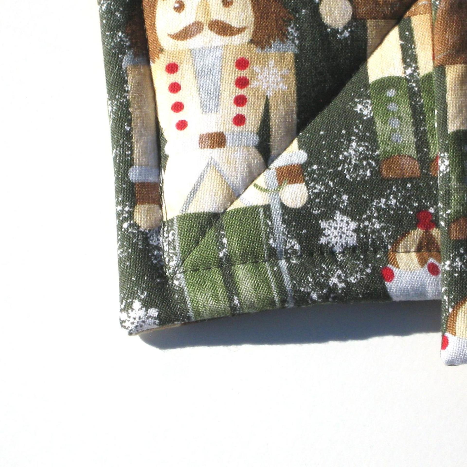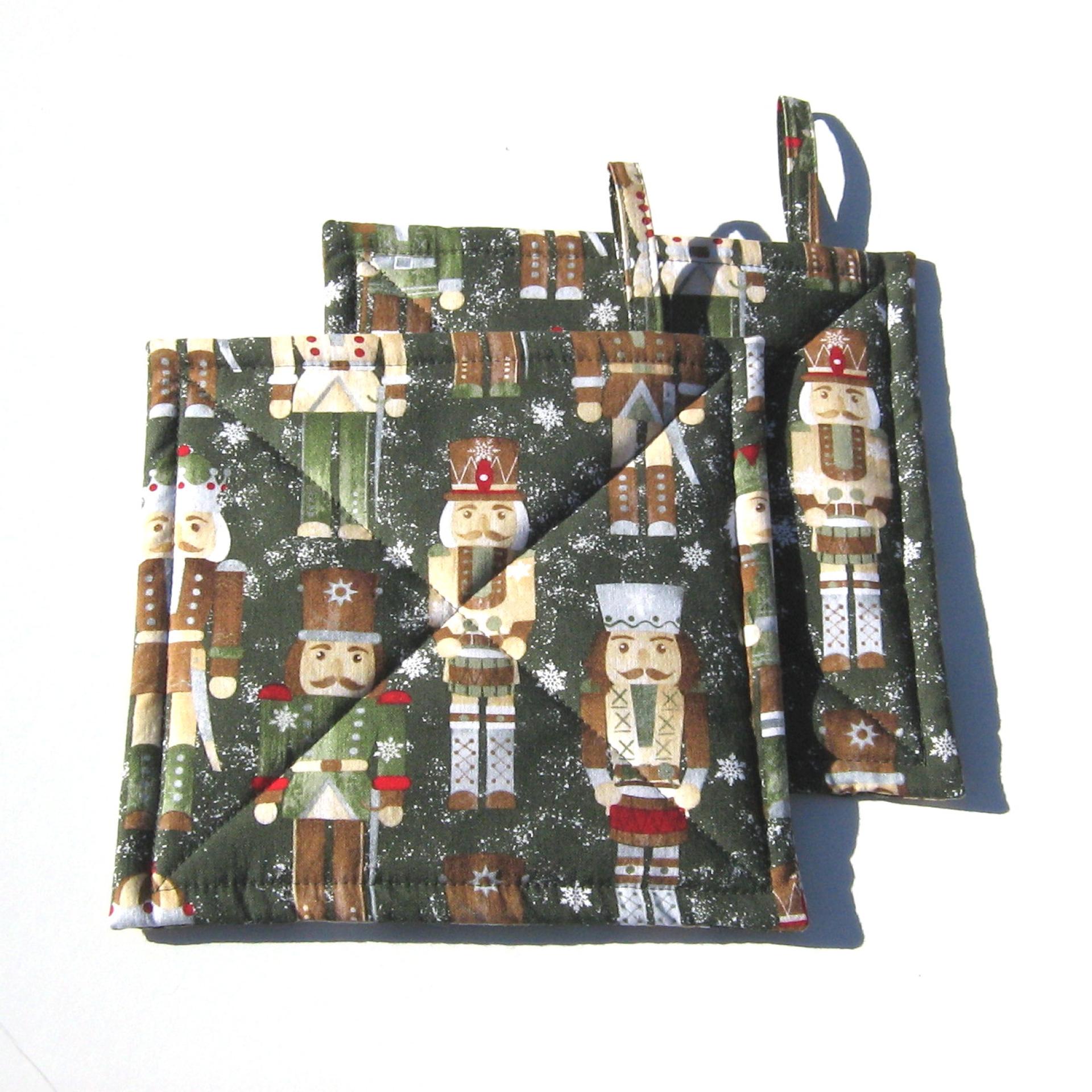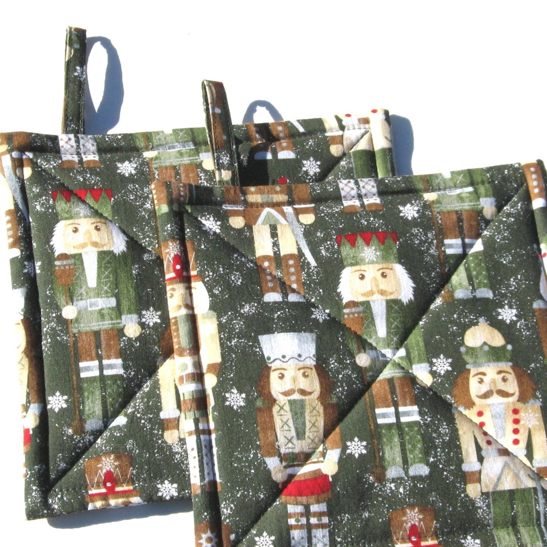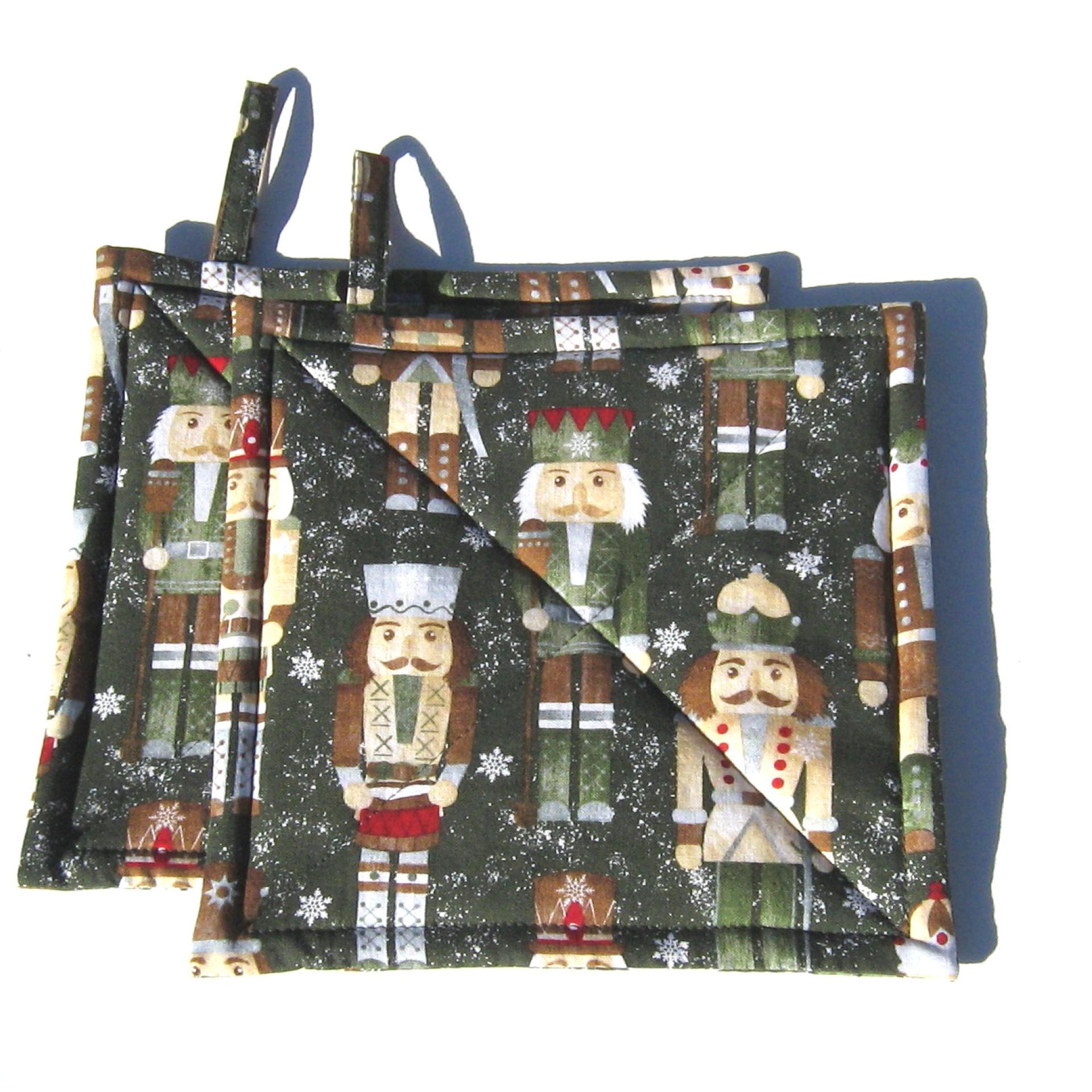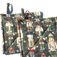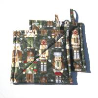 Nutcracker potholders, in green, tan, brown, white and red on a moss green background dotted with falling snow. Perfect for your holiday kitchen, also makes a very nice housewarming or hostess gift, and an exceptionally useful stocking stuffer.