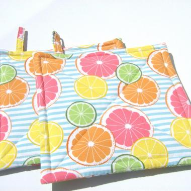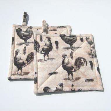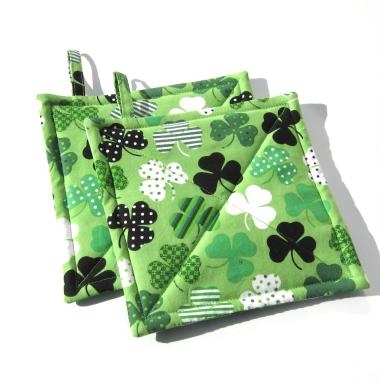 Set of two handmade potholders, approx. 8x8 inches, made of premium quality cotton; filling consists of one layer Insul-Bright reflective metallic padding, plus a layer of cotton batting. Wash cool, dry low.