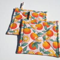 Set of two potholders, approx. 8x8 inches, made of premium quality cotton; filling consists of one layer Insul-Bright reflective metallic padding, plus a layer of cotton batting. Same fabric on both sides.