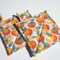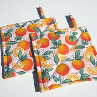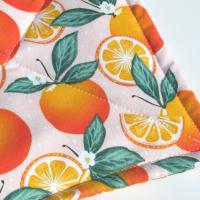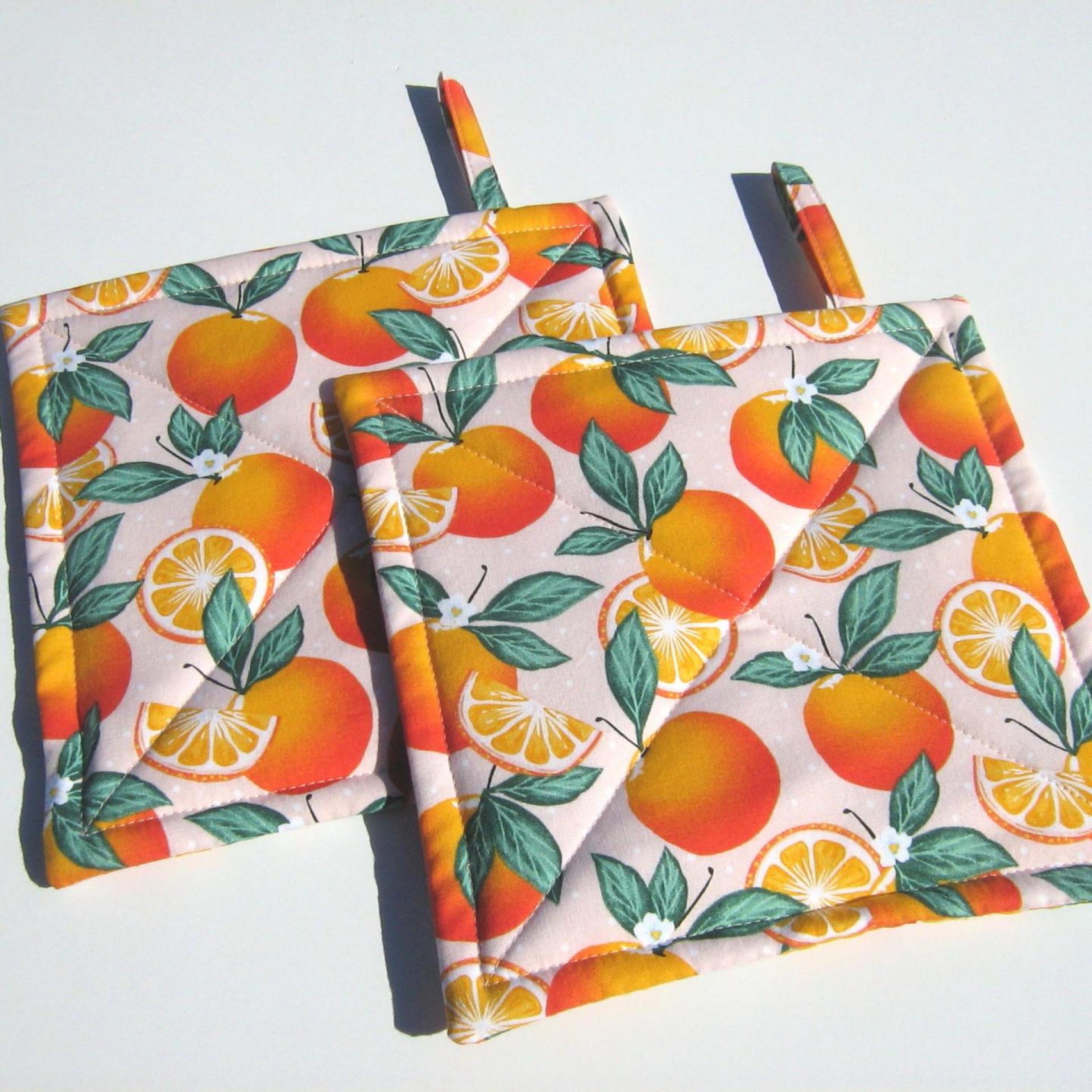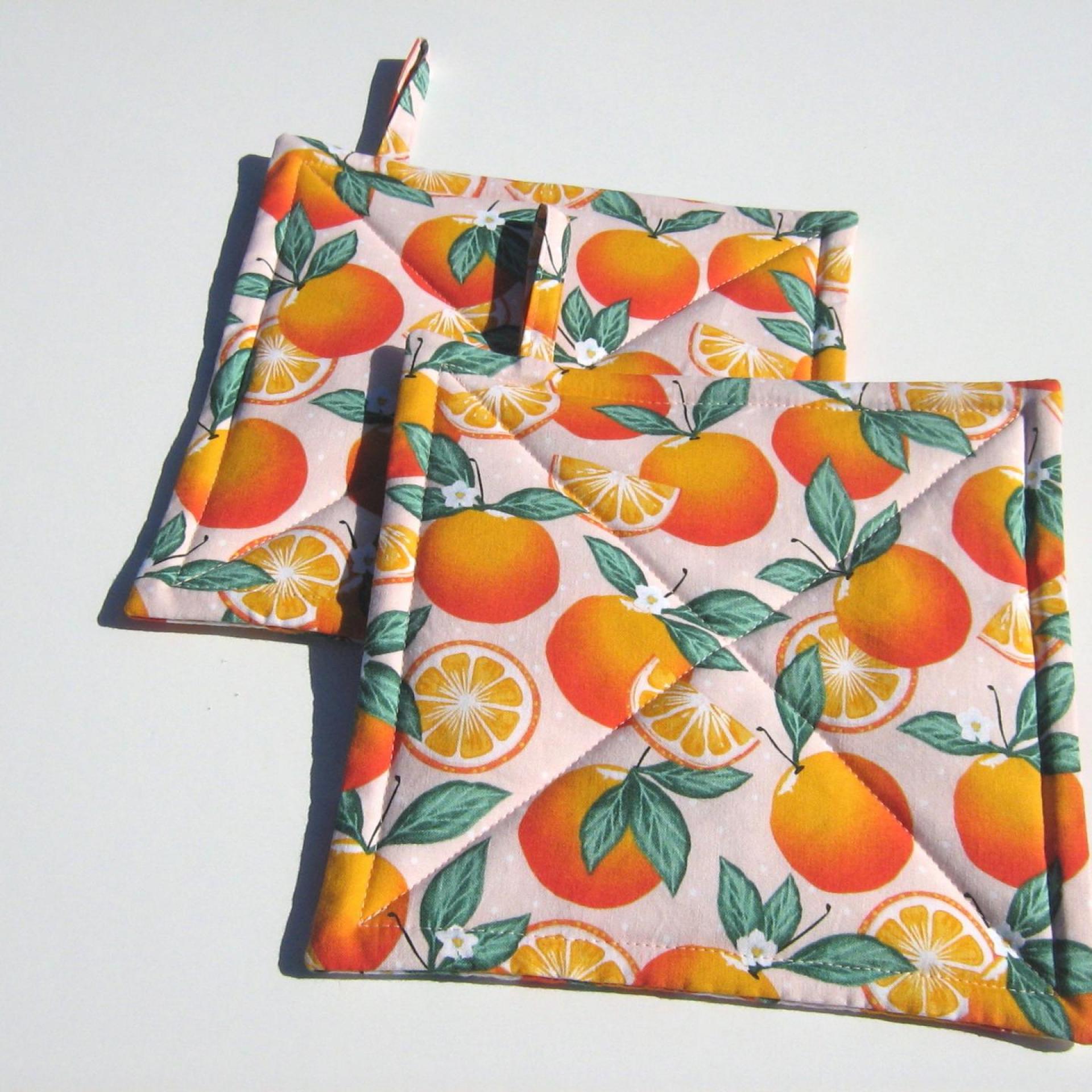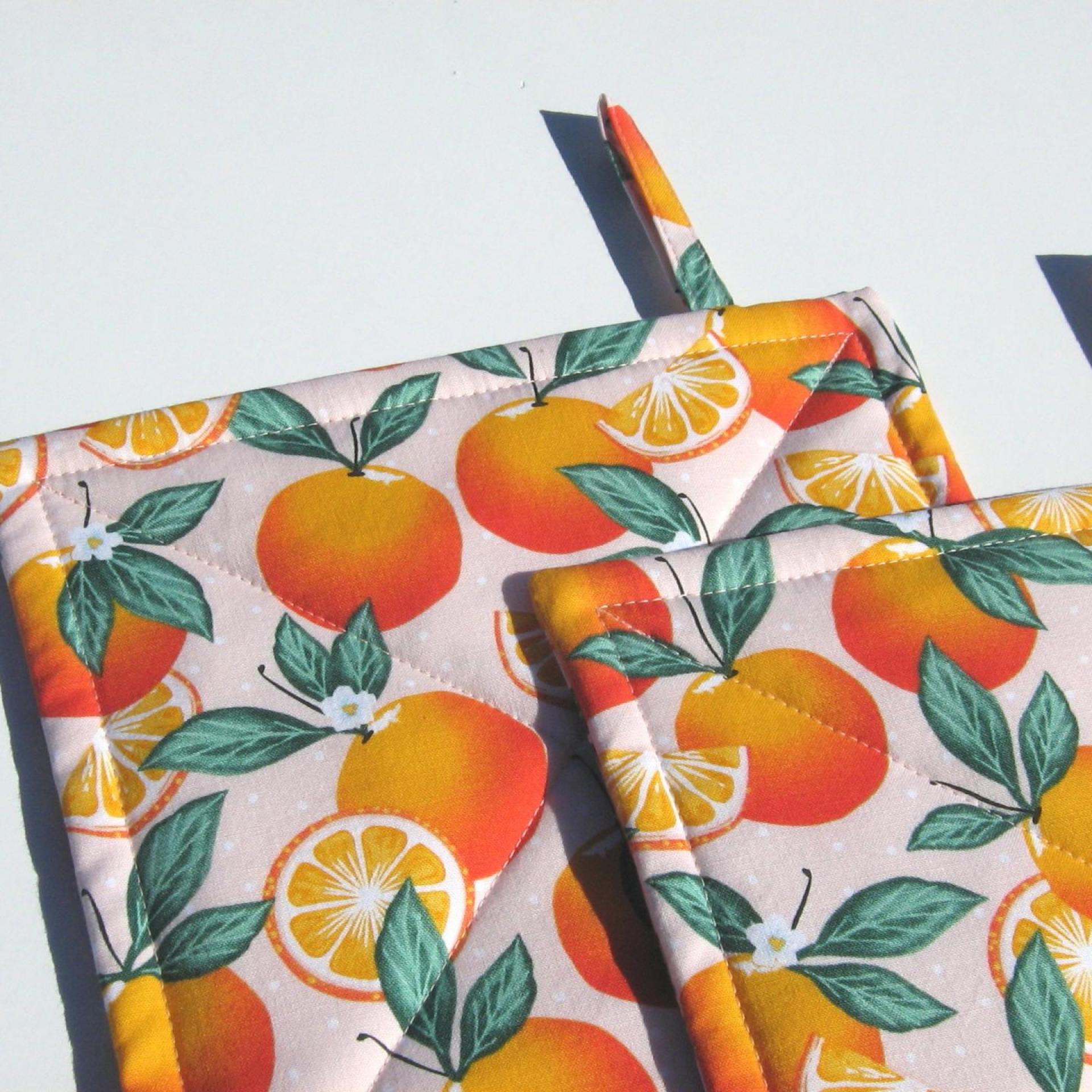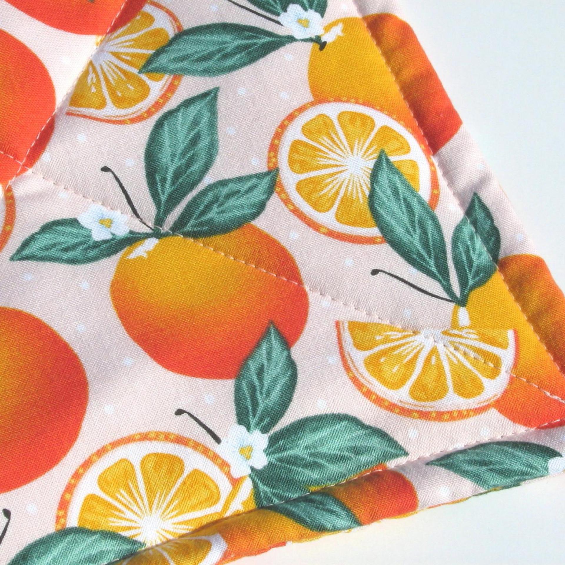 Luscious oranges, orange slices, blossoms and leaves in shades of orange and green, all on a background of blush pink with tiny white polka dots. Perfect as a housewarming or hostess gift, or a charming accent for your own kitchen.