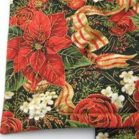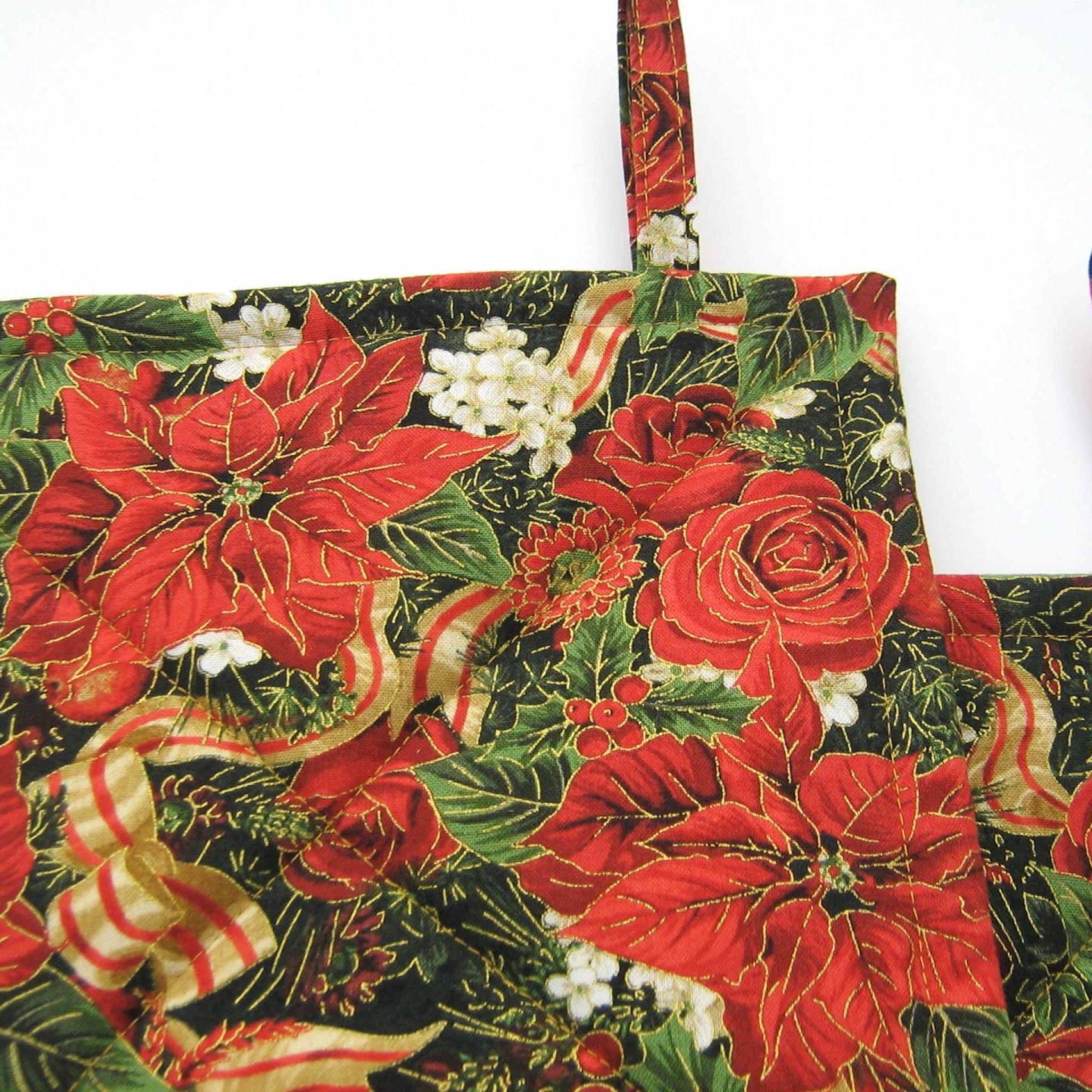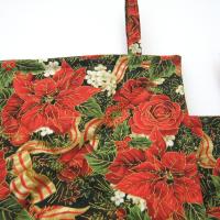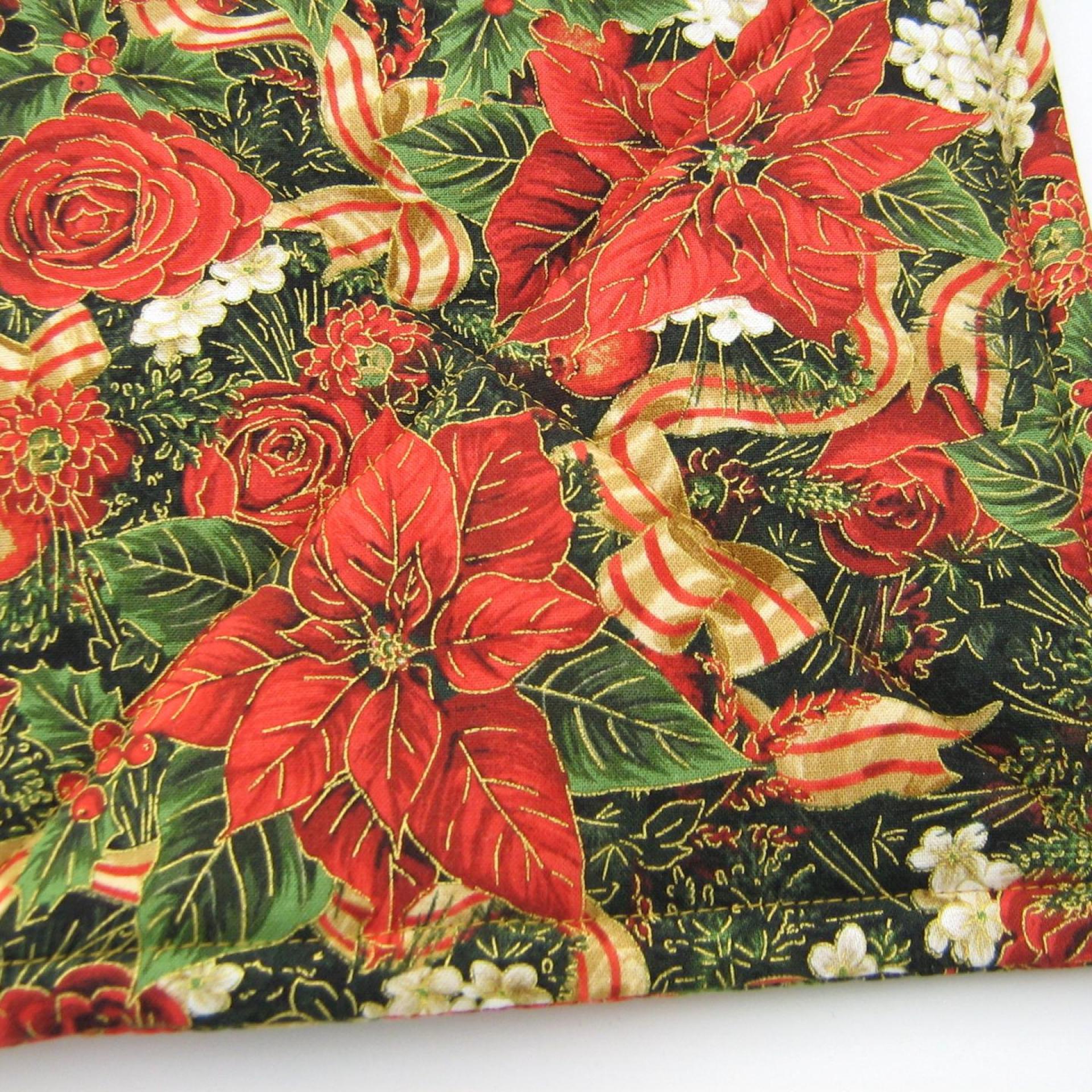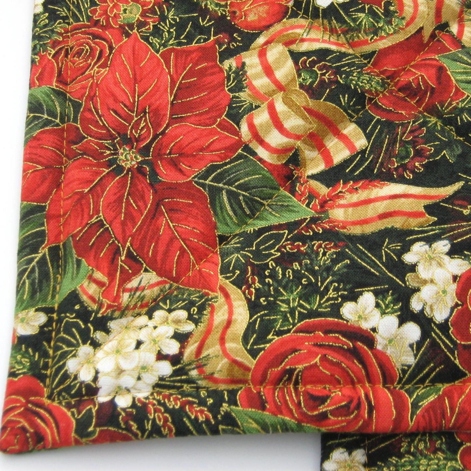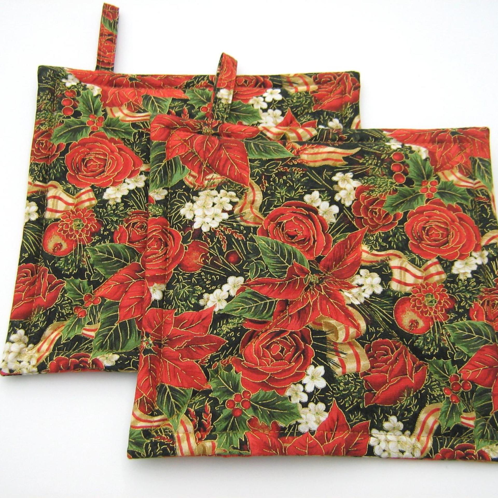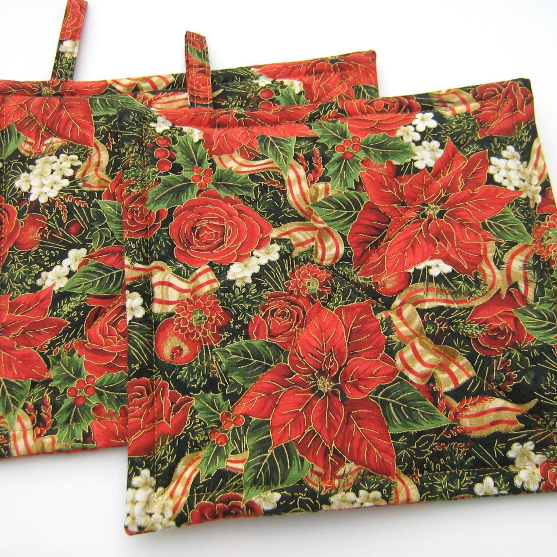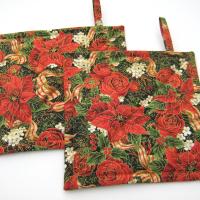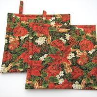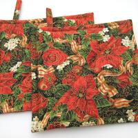 Handmade quilted potholders with a festive print of red poinsettia, roses, dahlias, pomegranates and holly, entwined with red-gold candy-striped ribbon, all of it finished with delicate gold outlines. Great stocking stuffer or hostess gift, or a charming accessory for your own kitchen.