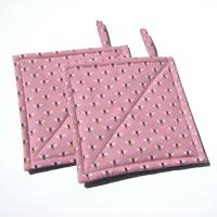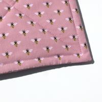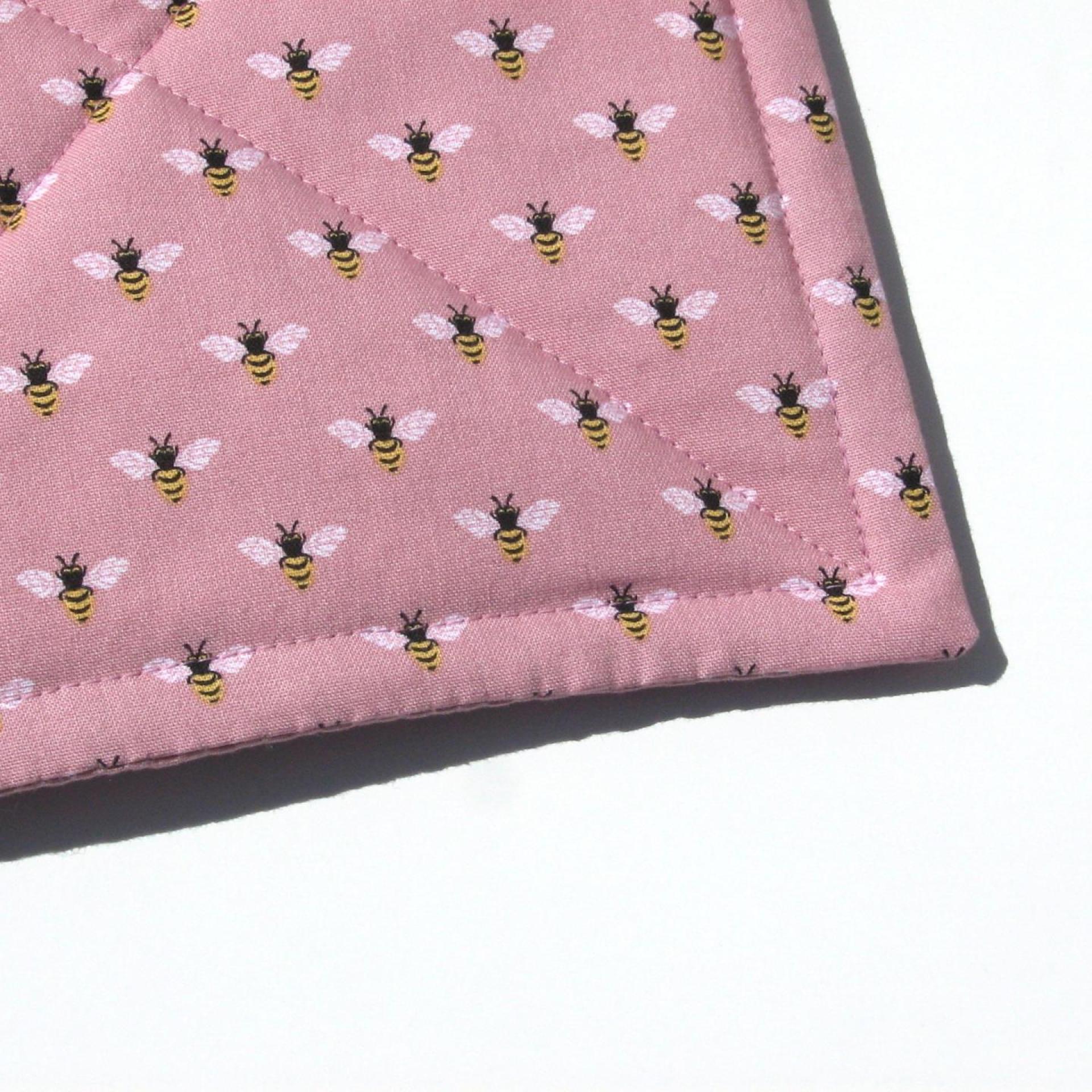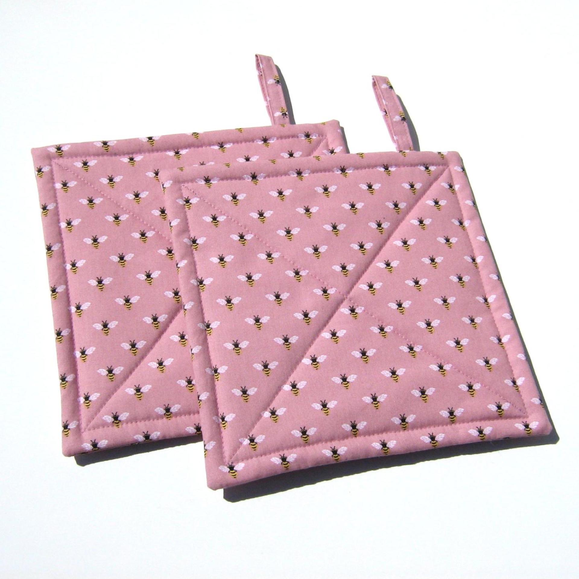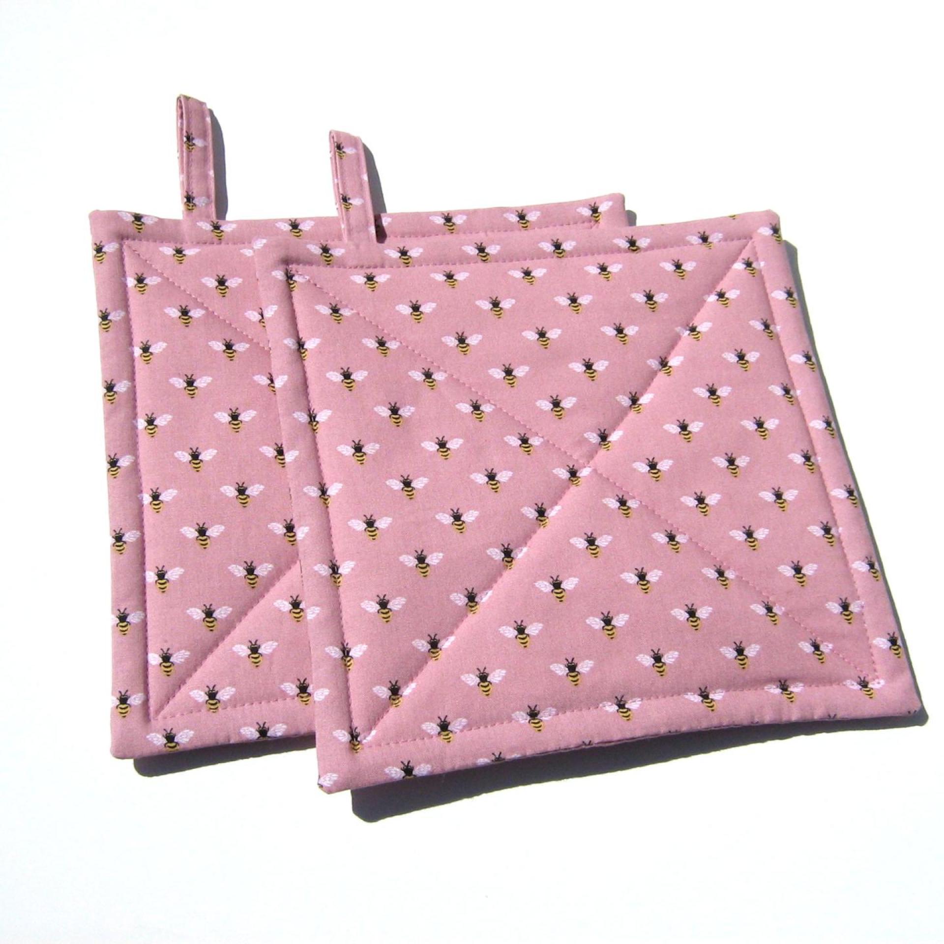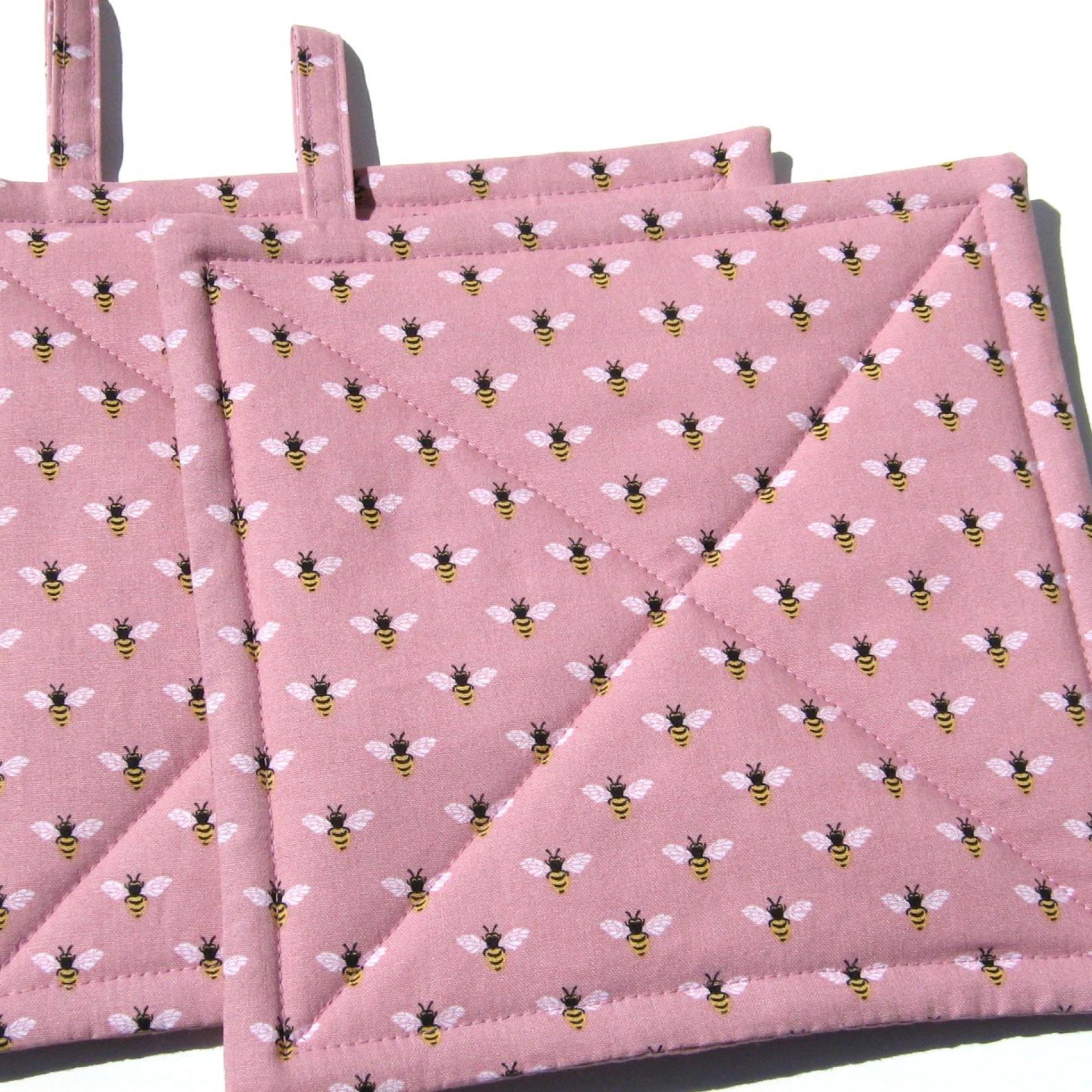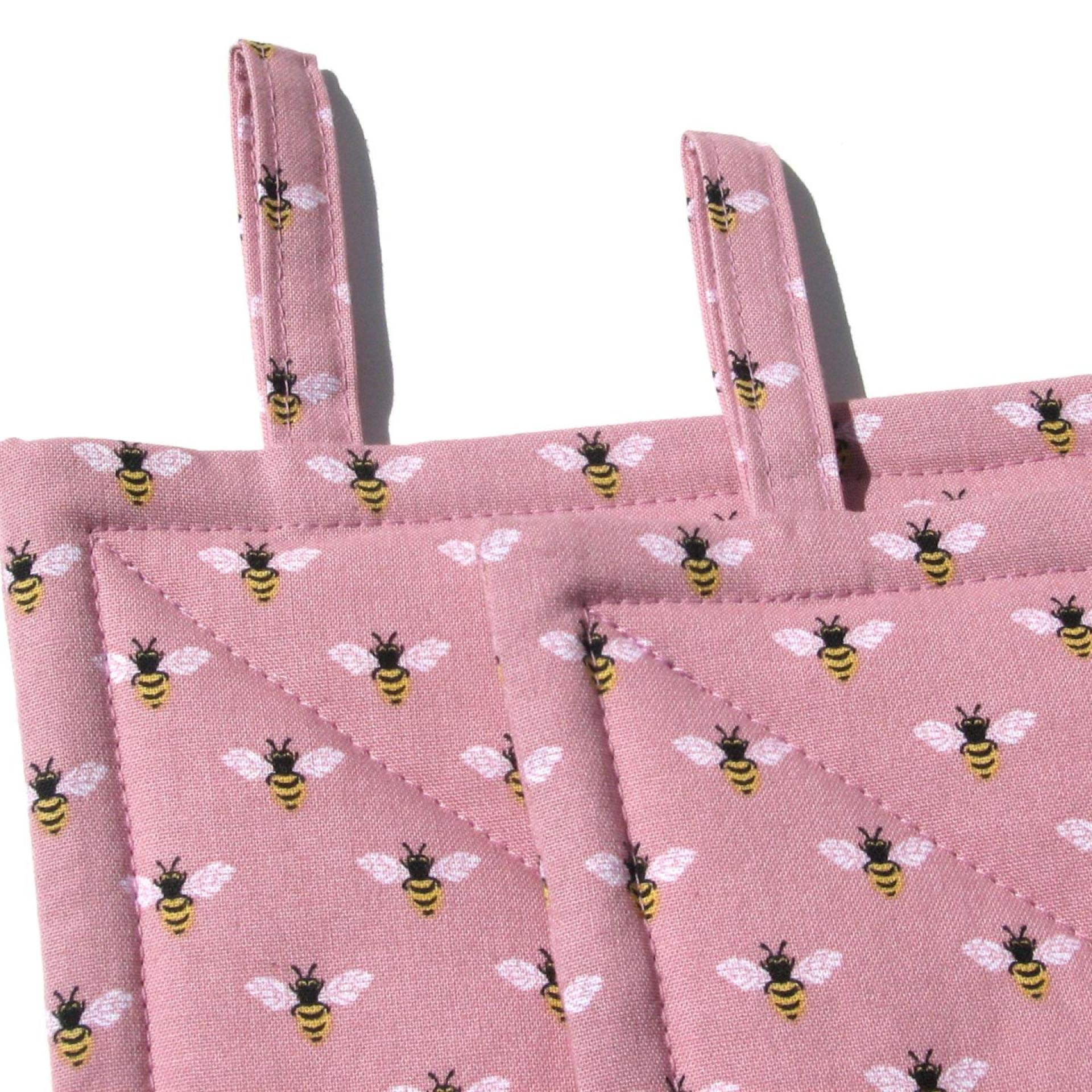 Quilted potholders with rows of bees in yellow, black and white, all on a dusty pink background. Perfect for gift giving, or as a charming accent for your own kitchen.