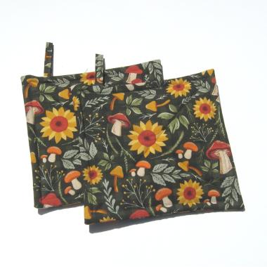 Set of two handmade potholders, approx. 8 x 8 inches, made of premium quality cotton; filling consists of one layer Insul-Bright reflective metallic padding, plus a layer of cotton batting. Same fabric front and back. Wash cool, dry low.