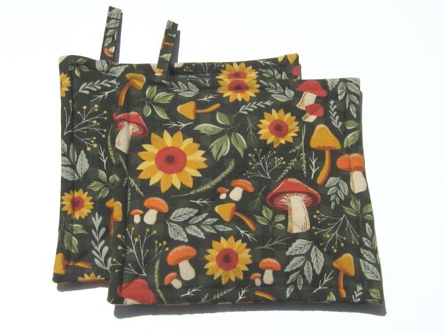 Set of two handmade hot pads, approx. 8 x 8 inches, made of premium quality cotton; filling consists of one layer Insul-Bright reflective metallic padding, plus a layer of cotton batting. Same fabric on both sides.