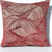 Geometric modern style pillow cover, with a pattern of fantastic swirly waves in dark cherry-red flocked velvet on a background of natural light taupe linen blend fabric. Color changes to deeper or lighter red, depending on how light falls on the surface. A fabulous design accent for the modern home
