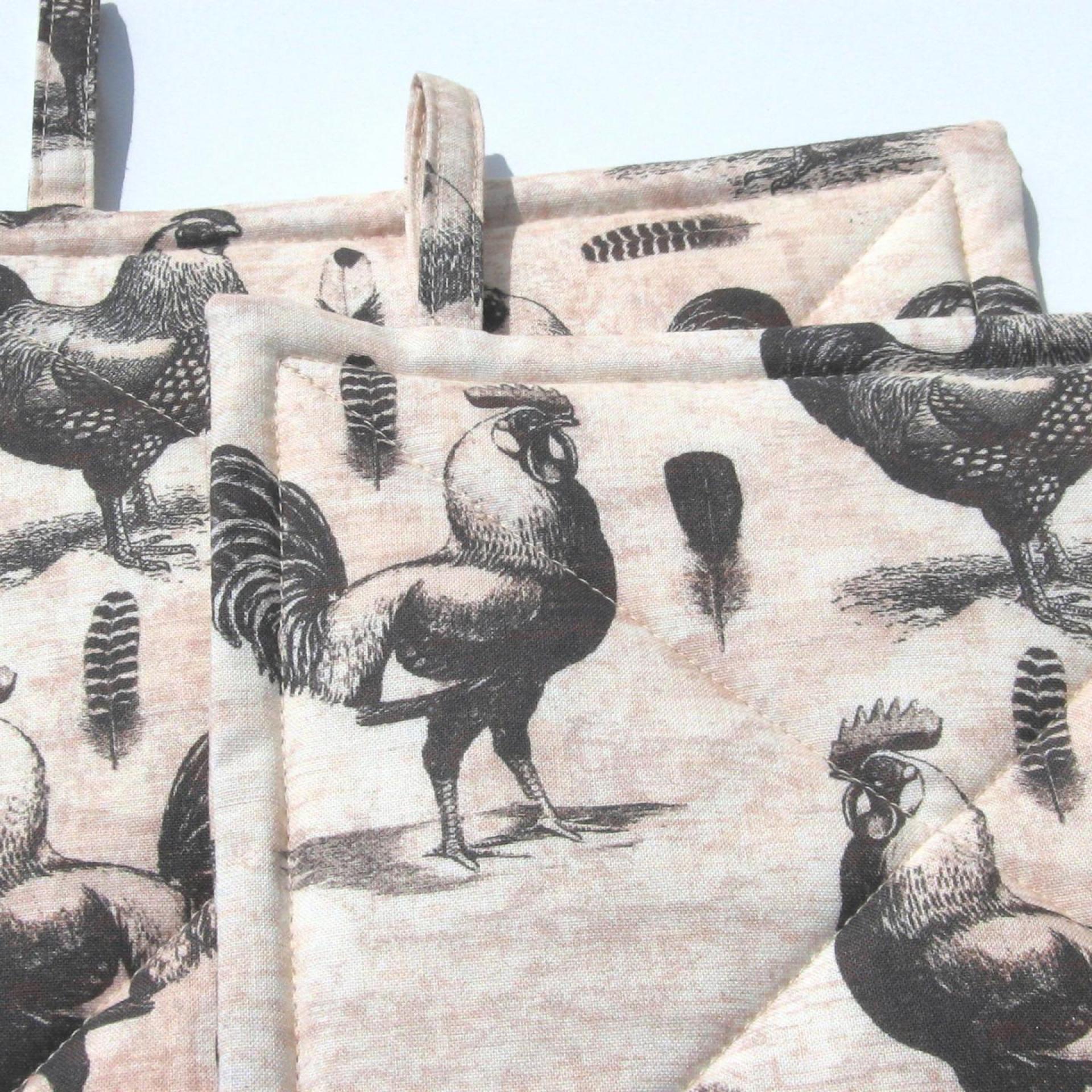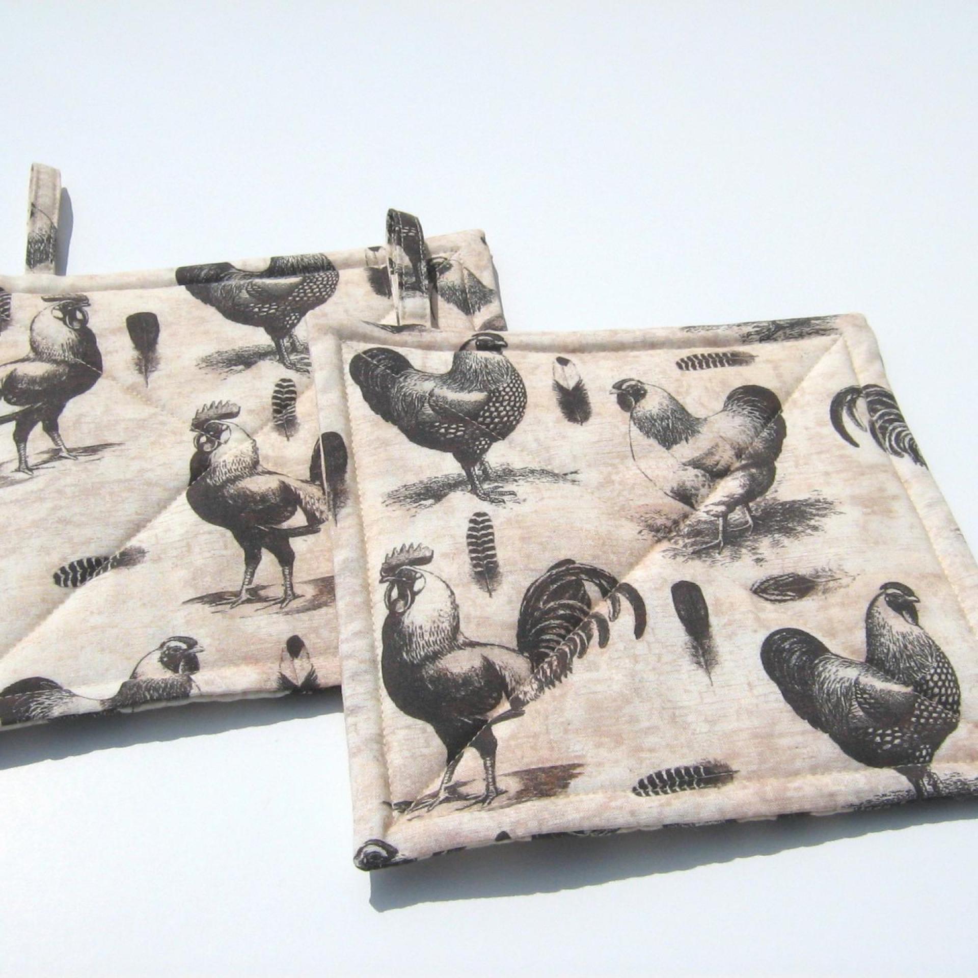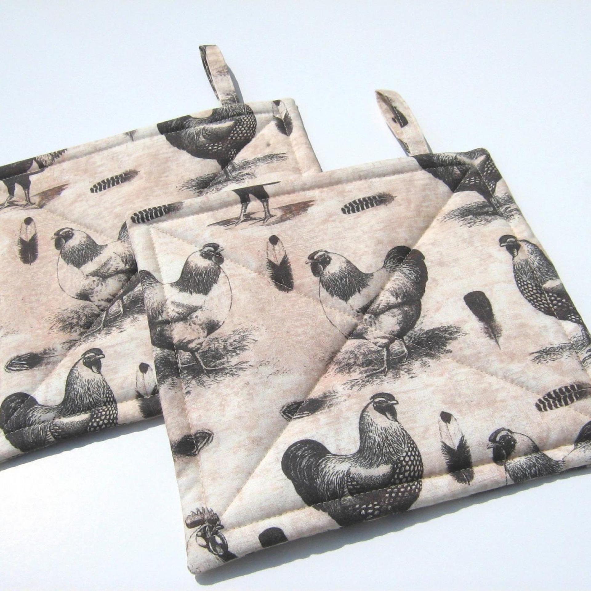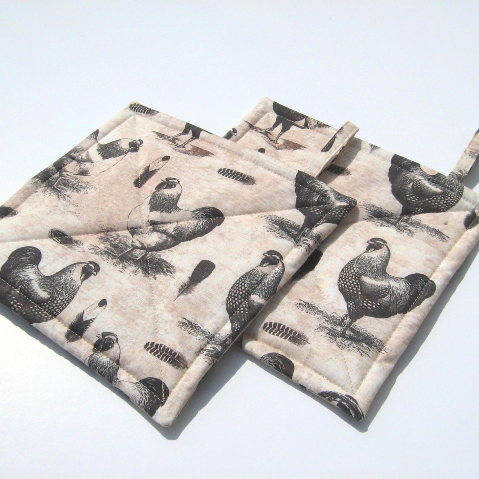 Handmade quilted potholders, 2 pc set with a fabulous print of roosters and chickens in black, grey, pink sand and cream. Perfect for a housewarming or hostess gift, or for your own fabulous kitchen.