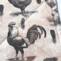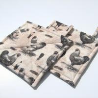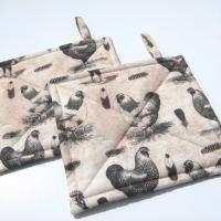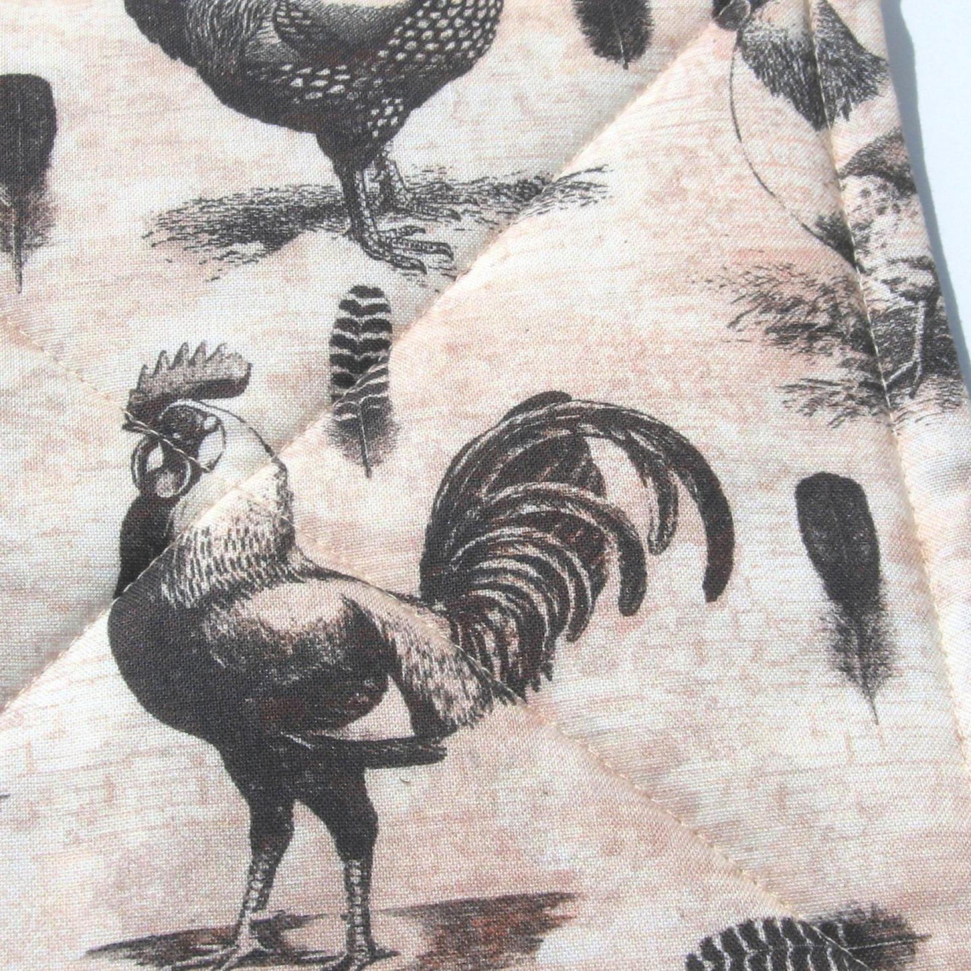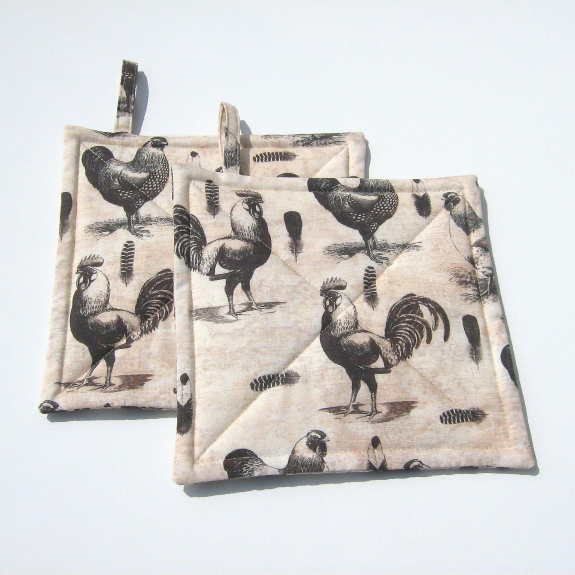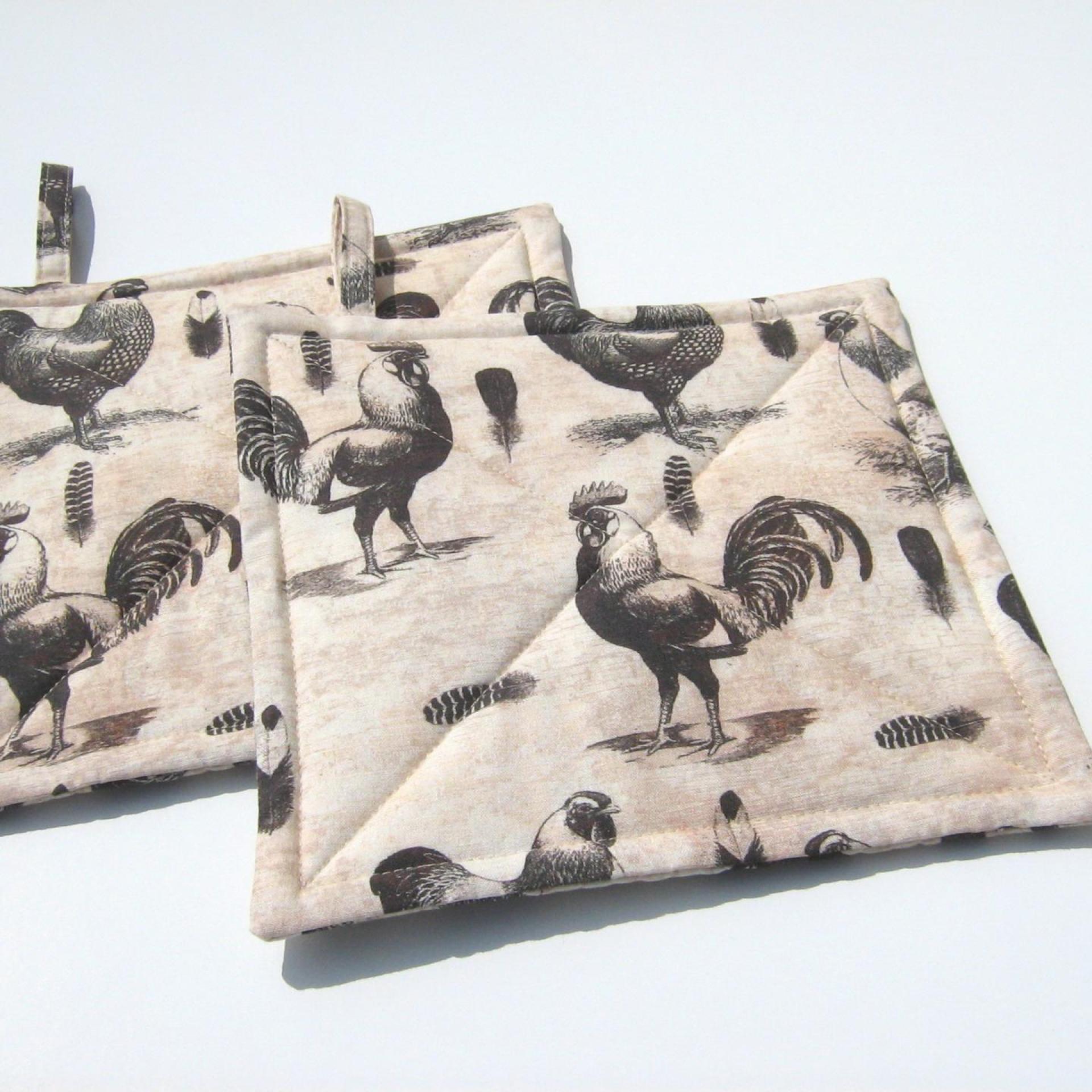 Handmade quilted potholders, 2 pc set with a fabulous print of roosters and chickens in black, grey, pink sand and cream. Perfect for a housewarming or hostess gift, or for your own fabulous kitchen.