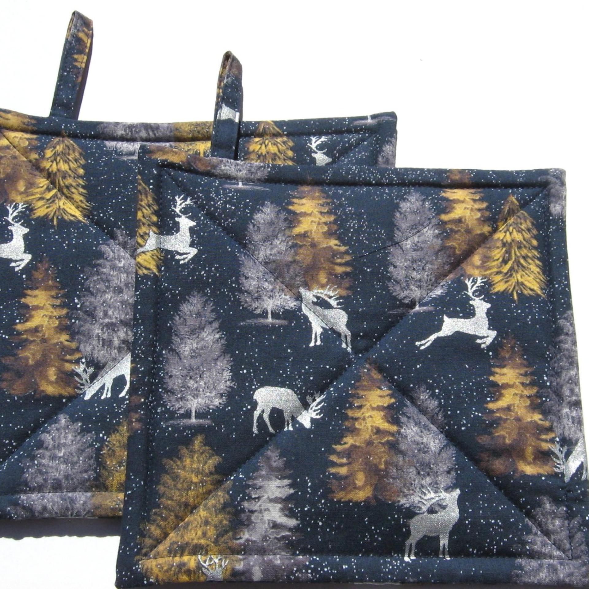 Christmas potholders featuring silver reindeer with gray and golden trees on a navy-blue background dotted with falling snow. Perfect for your own kitchen, also makes a very nice holiday housewarming or hostess gift and a perfect stocking stuffer.