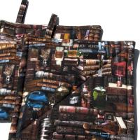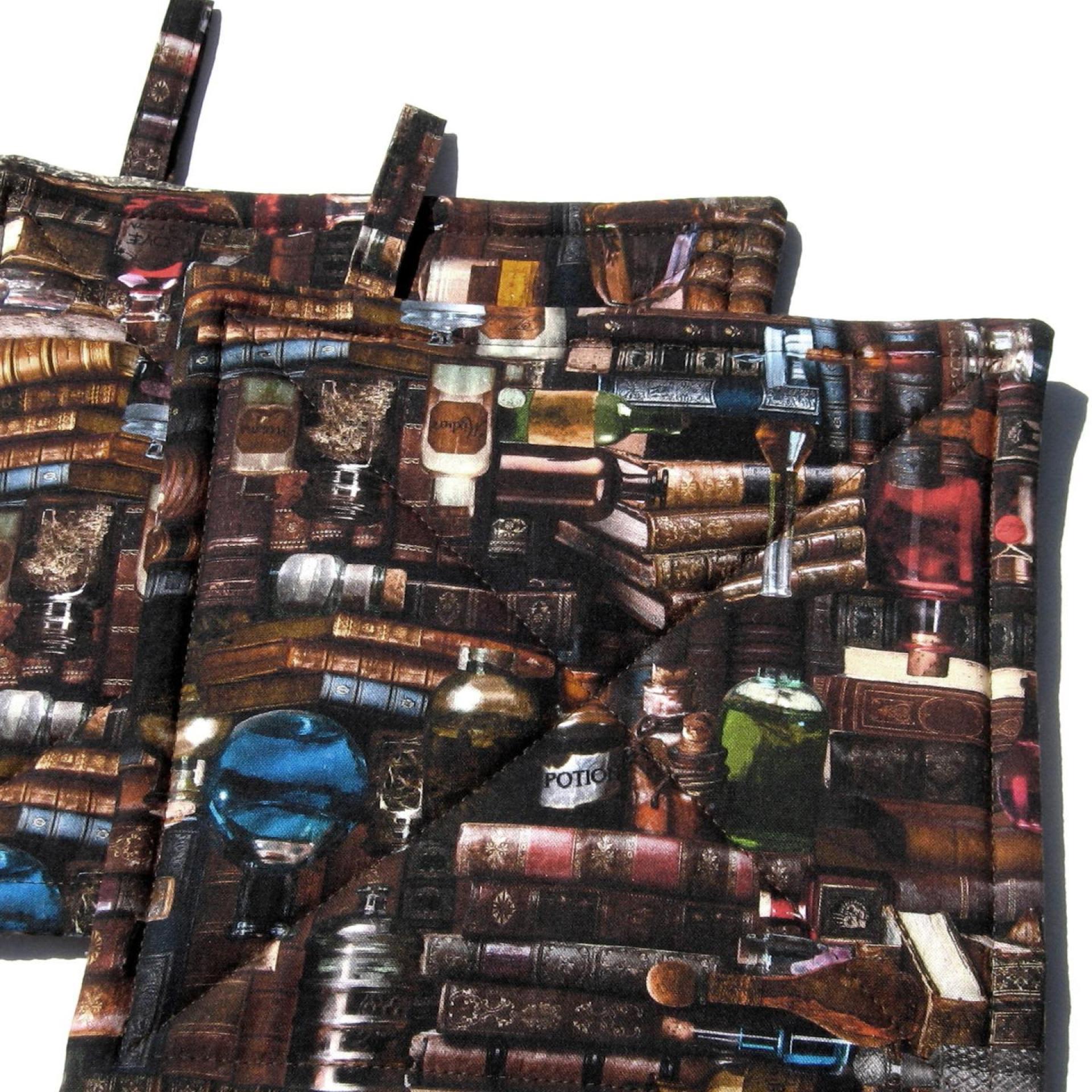 Halloween potholders featuring stacks of old-timey books and bottles in shades of muted browns, rust, blue and green. Perfect accessory for decorating a Halloween kitchen, or as a bringsel for the hostess of a spooky party.