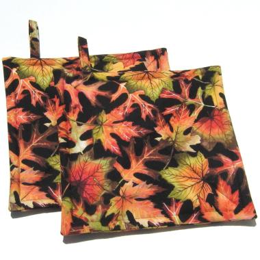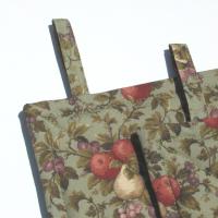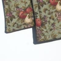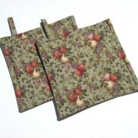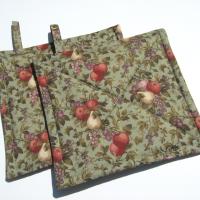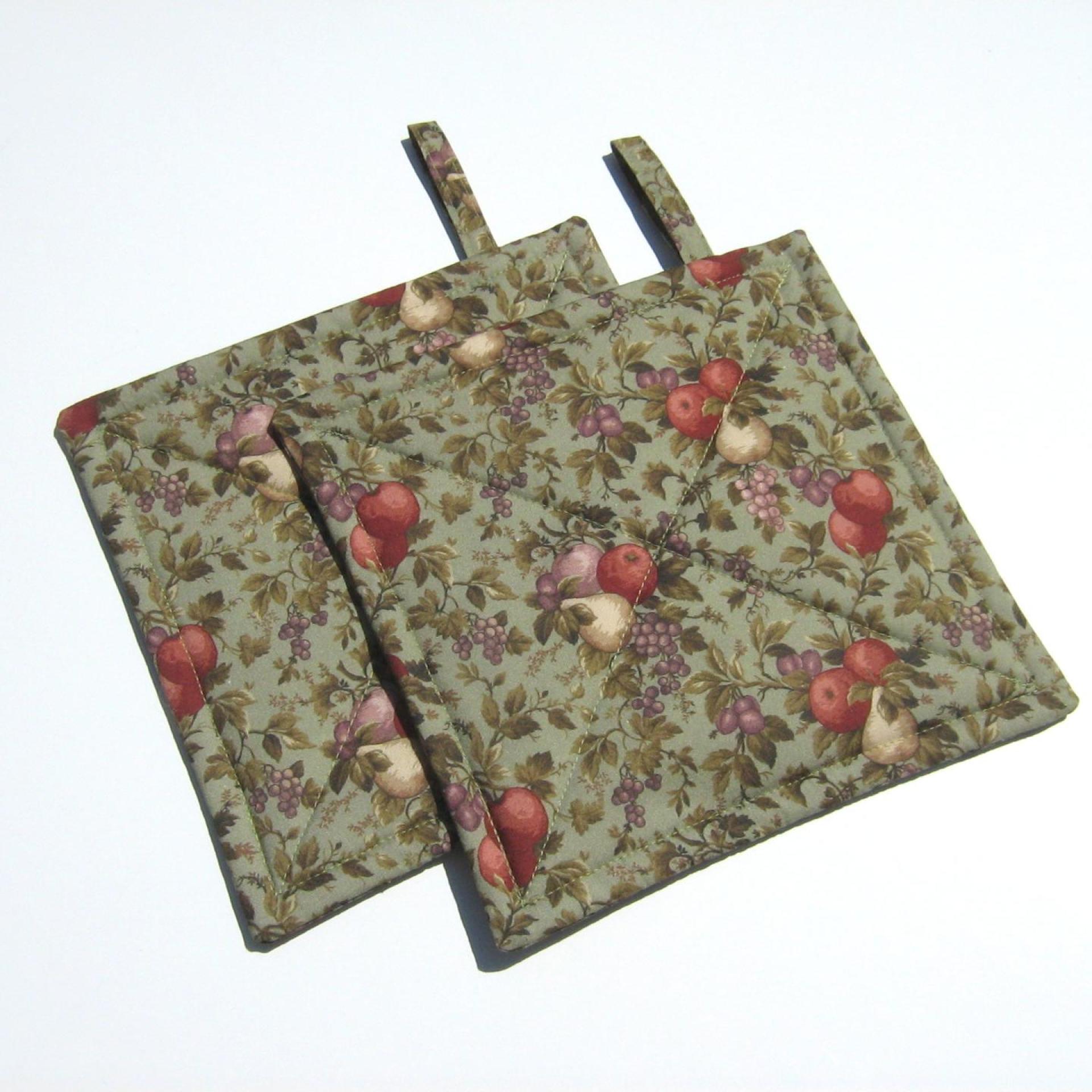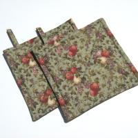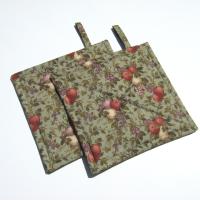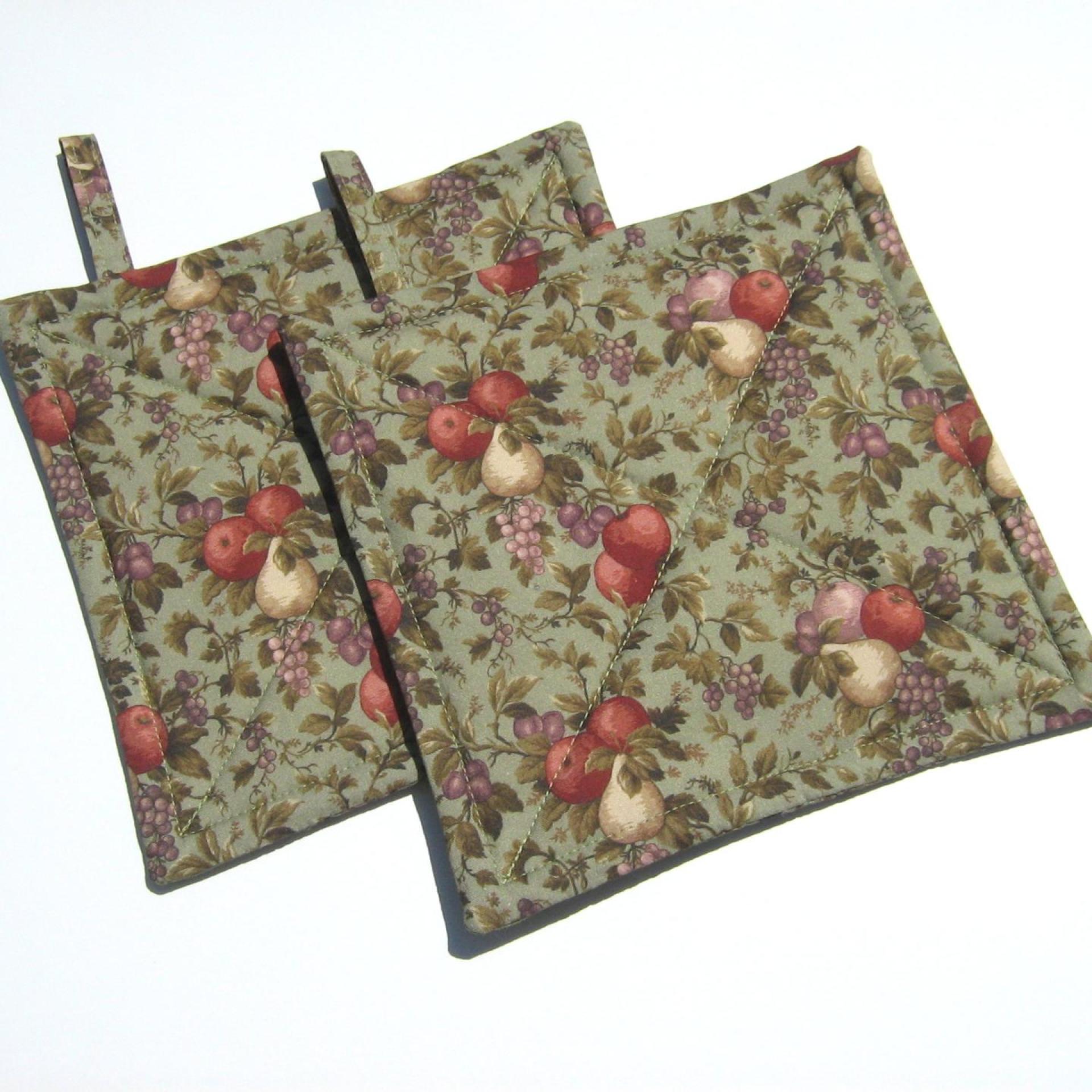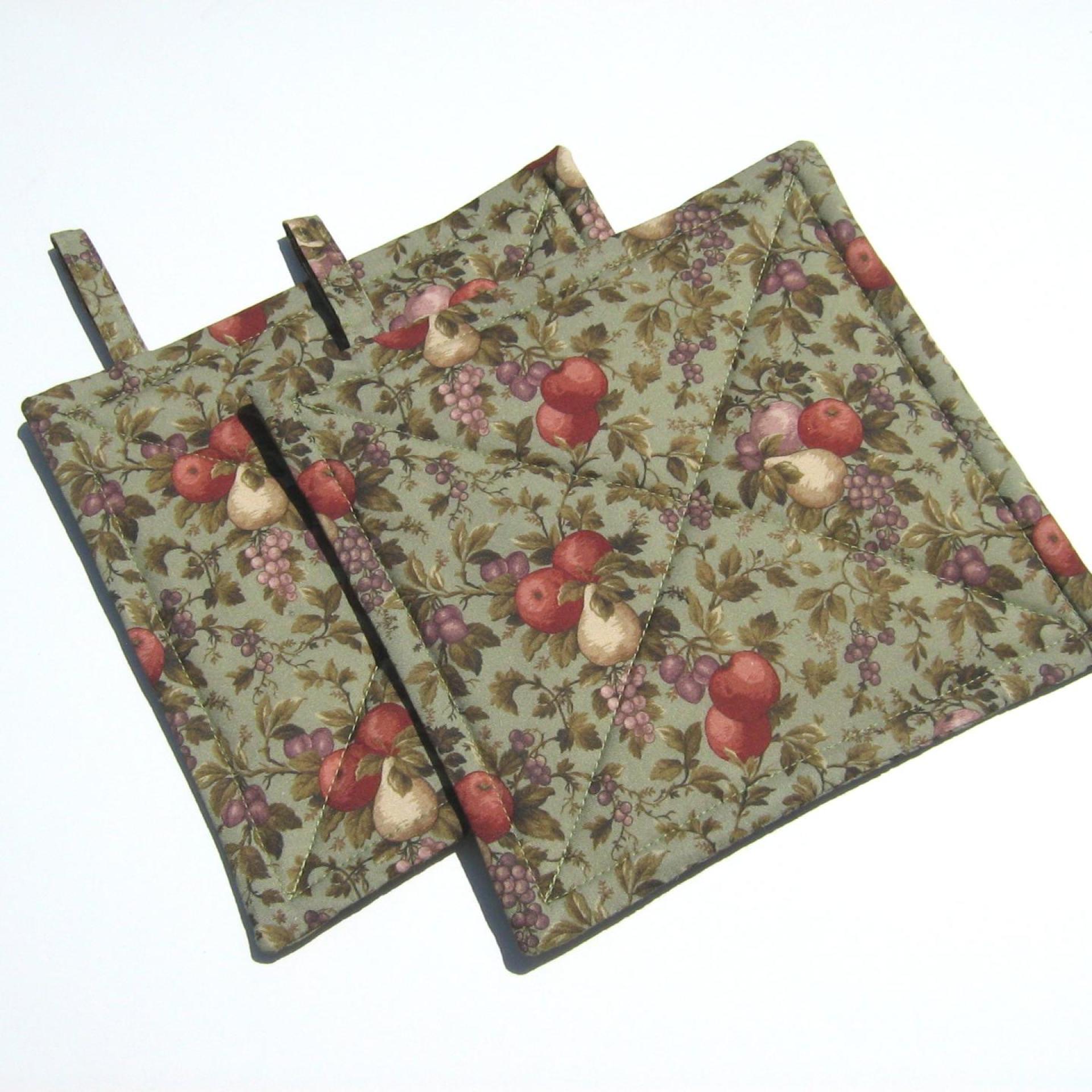 Handmade quilted potholders with a wonderful late-summer print of red apples, pears, plums and grapes, surrounded by foliage, all of it in lovely old-master shades or red, yellow, green and dusky purple. Super trendy for the new green kitchen colors!