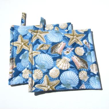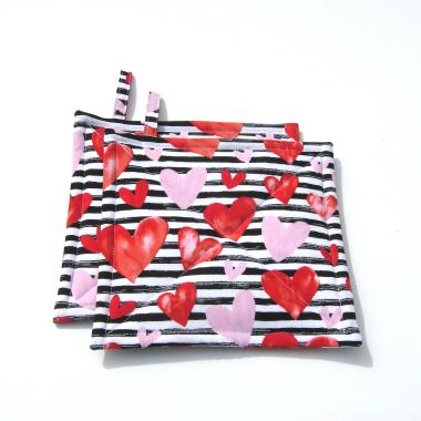 Set of two handmade potholders, approx. 8x8 inches, made of premium quality cotton; filling consists of one layer Insul-Bright reflective metallic padding, plus a layer of cotton batting. Wash cool, dry low.