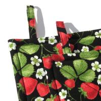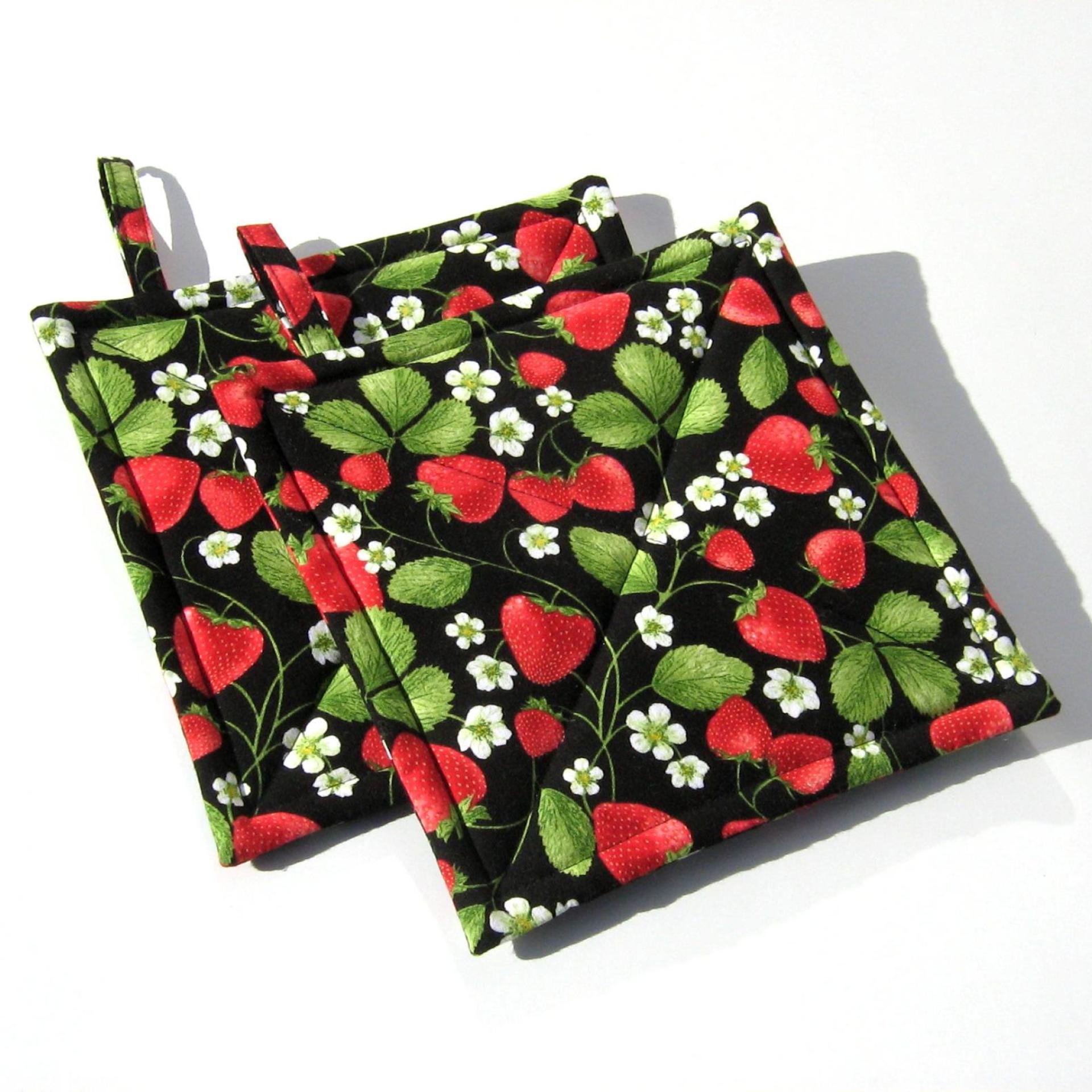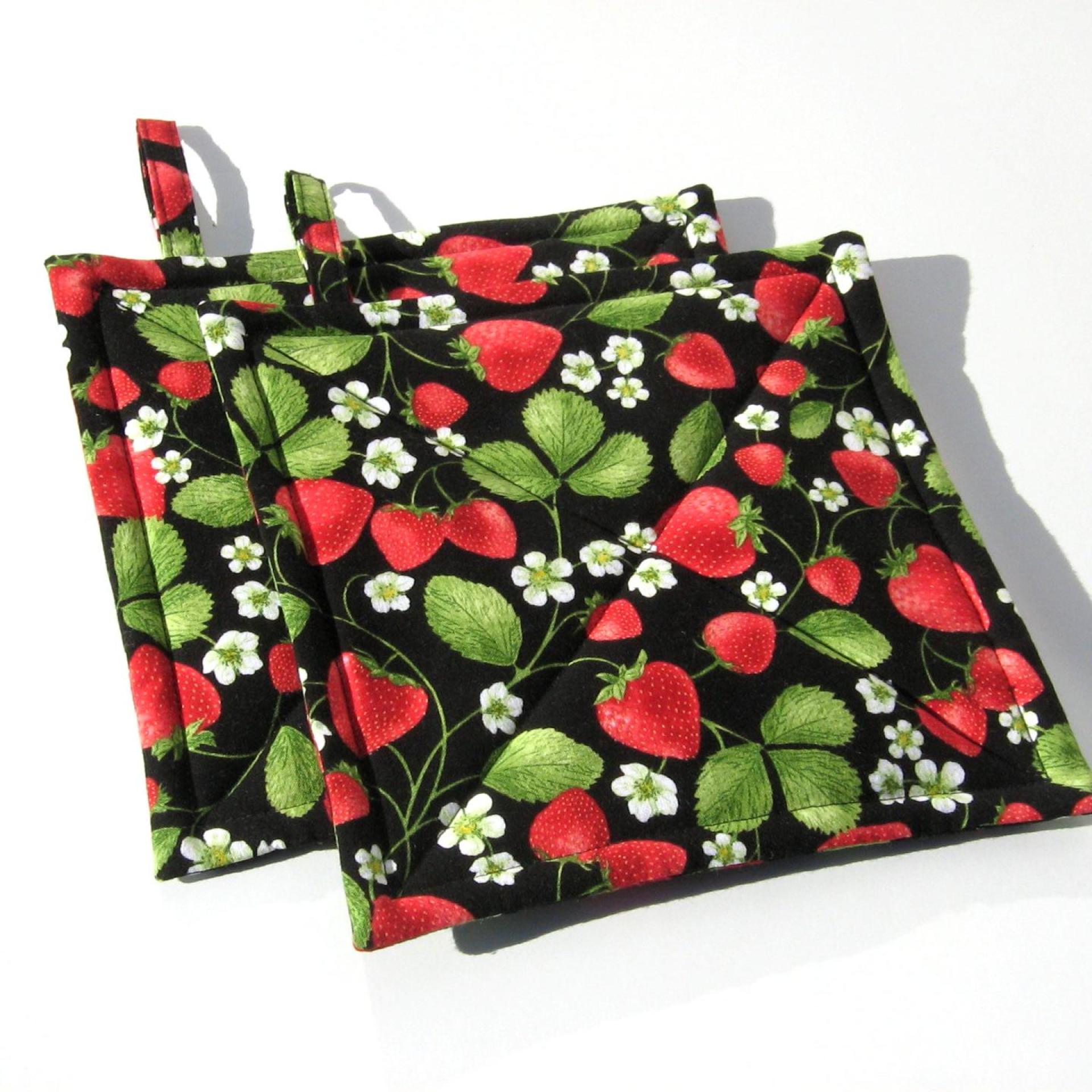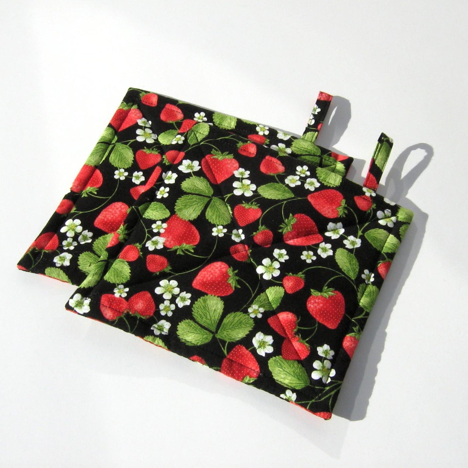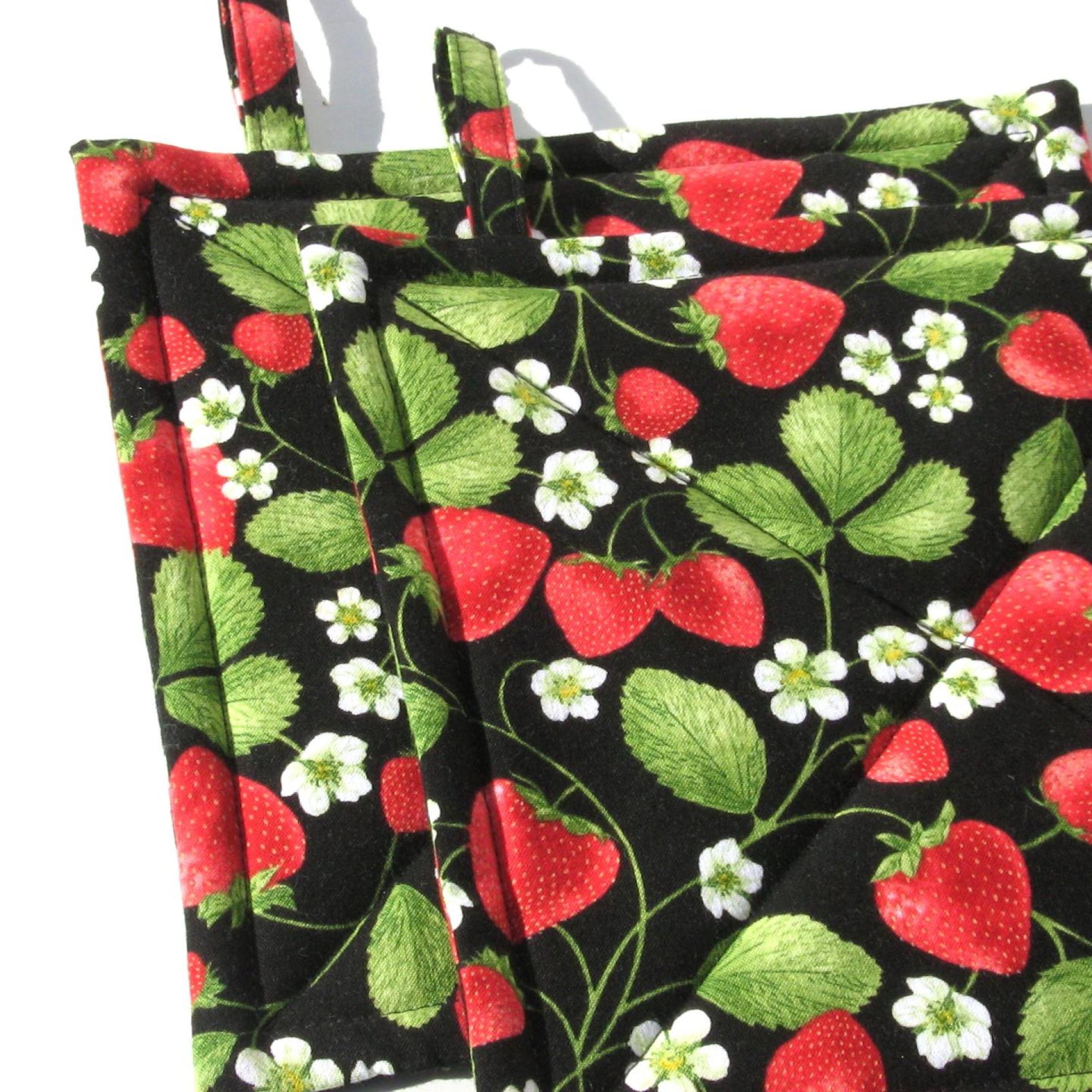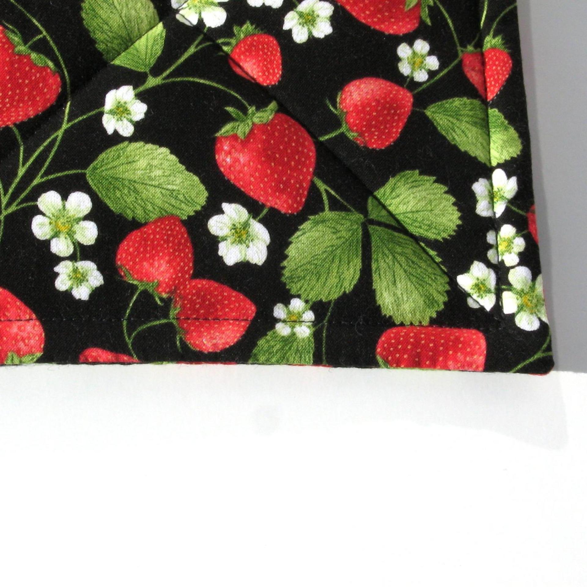 Quilted strawberry potholders featuring lovely, luscious red strawberries with leaves and blossoms on a black background. Nothing says spring has arrived like fresh strawberries! A fun accent to welcome spring into the home, a gift for yourself or a special friend.