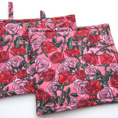 Set of two handcrafted potholders, approx. 8 x 8 inches, made of premium quality cotton; filling consists of one layer Insul-Bright reflective metallic padding, plus a layer of cotton batting. Same fabric front and back. Wash cool, dry low.