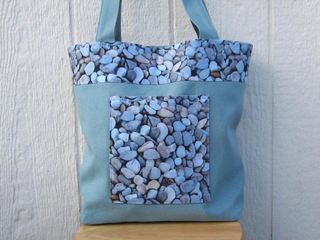 Top and bottom sections are all denim, diagonally quilt-stitched all around. Bottom and handles are made of the same sturdy denim. Body and bottom are quilted onto fusible fleece batting.