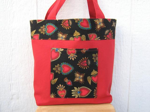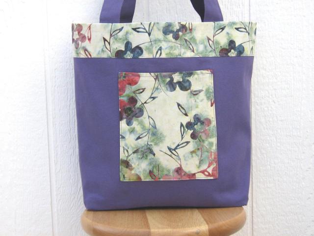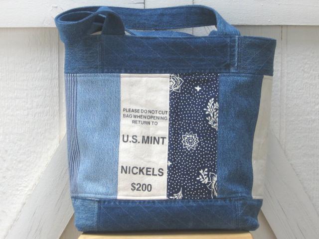 The middle section utilizes patchwork construction, alternating strips of denim and the floral cotton. Top and bottom sections are all denim, diagonally quilt-stitched all around. Bottom and handles are made of the same sturdy denim. Body and bottom are quilted onto fusible fleece batting.