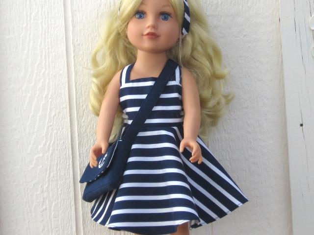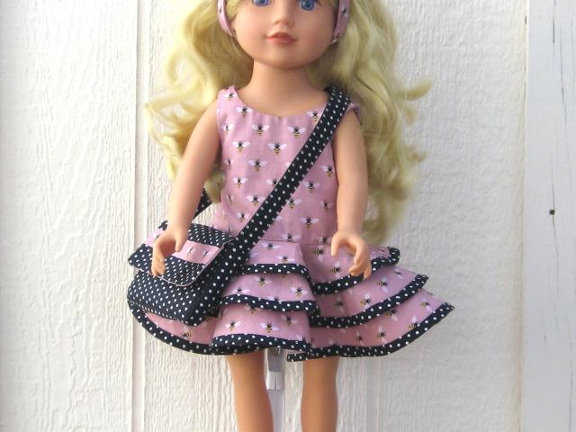 Exquisite travel or party dress set for an 18-inch doll; included is this fabulous dress in a super summery yellow on black lemon print. Each of the skirt's three tiers is edged with bright yellow bias trim.
